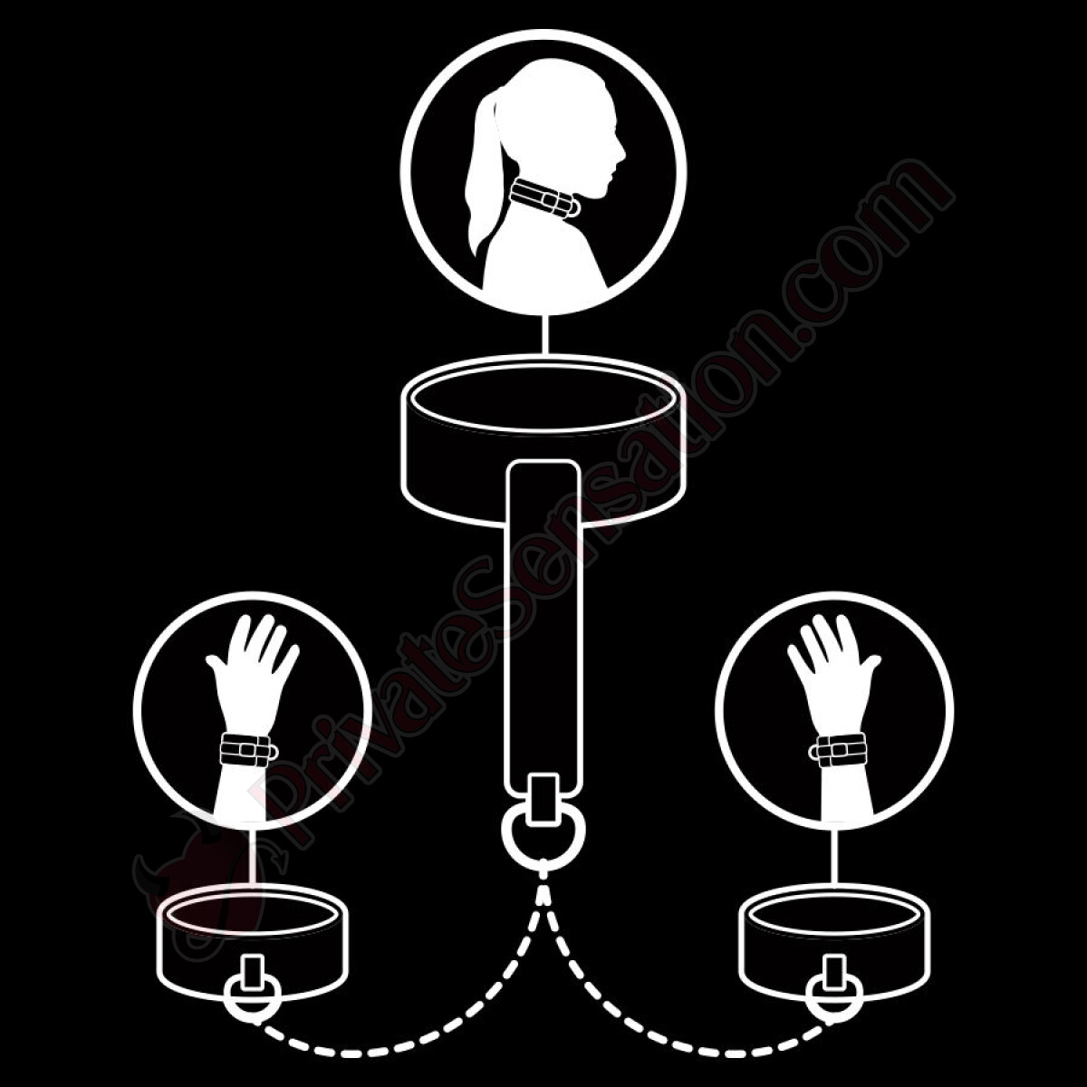 Indossa comodamente il cinturino per il collo, posiziona le mani dietro la schiena e fissa i braccialetti. Collega tutto con la catena in metallo inclusa per una sottomissione totale. Ideale per immobilizzare dalle mani al collo, trasformando ogni gioco in un'esperienza indimenticabile.