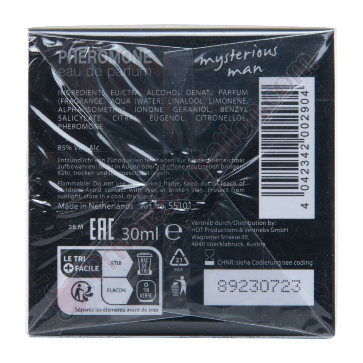 Alcool denaturato, profumo (fragranza), acqua, linalolo, limonene, alfa-isometil ionone, geraniolo, salicilato di benzile, citrale, eugenolo, citronellolo, feromone.