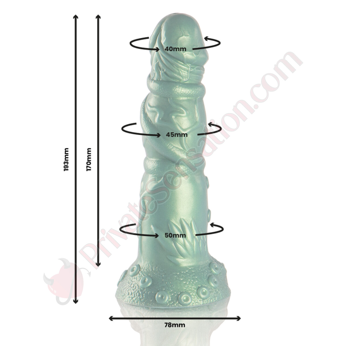 La struttura del dildo è solida e compatta. Il design inizia con una punta di 40 mm, prosegue con una sezione superiore di 45 mm e termina con una sezione inferiore di 50 mm, creando una sensazione di pienezza crescente. La base larga 78 mm garantisce una presa sicura e stabile durante l'utilizzo.
