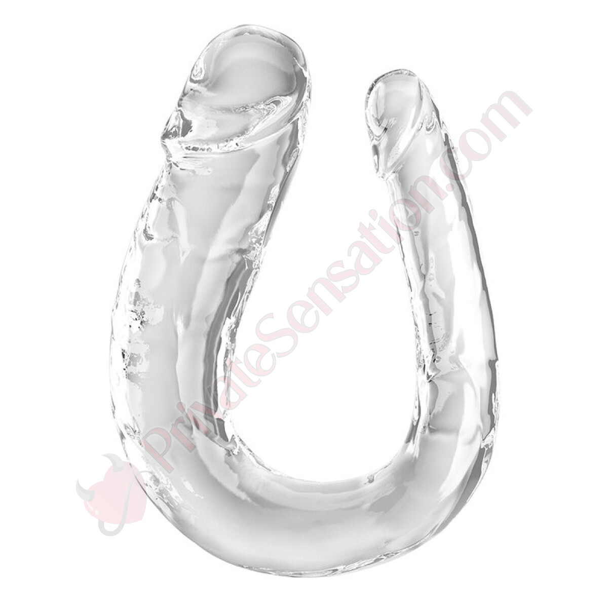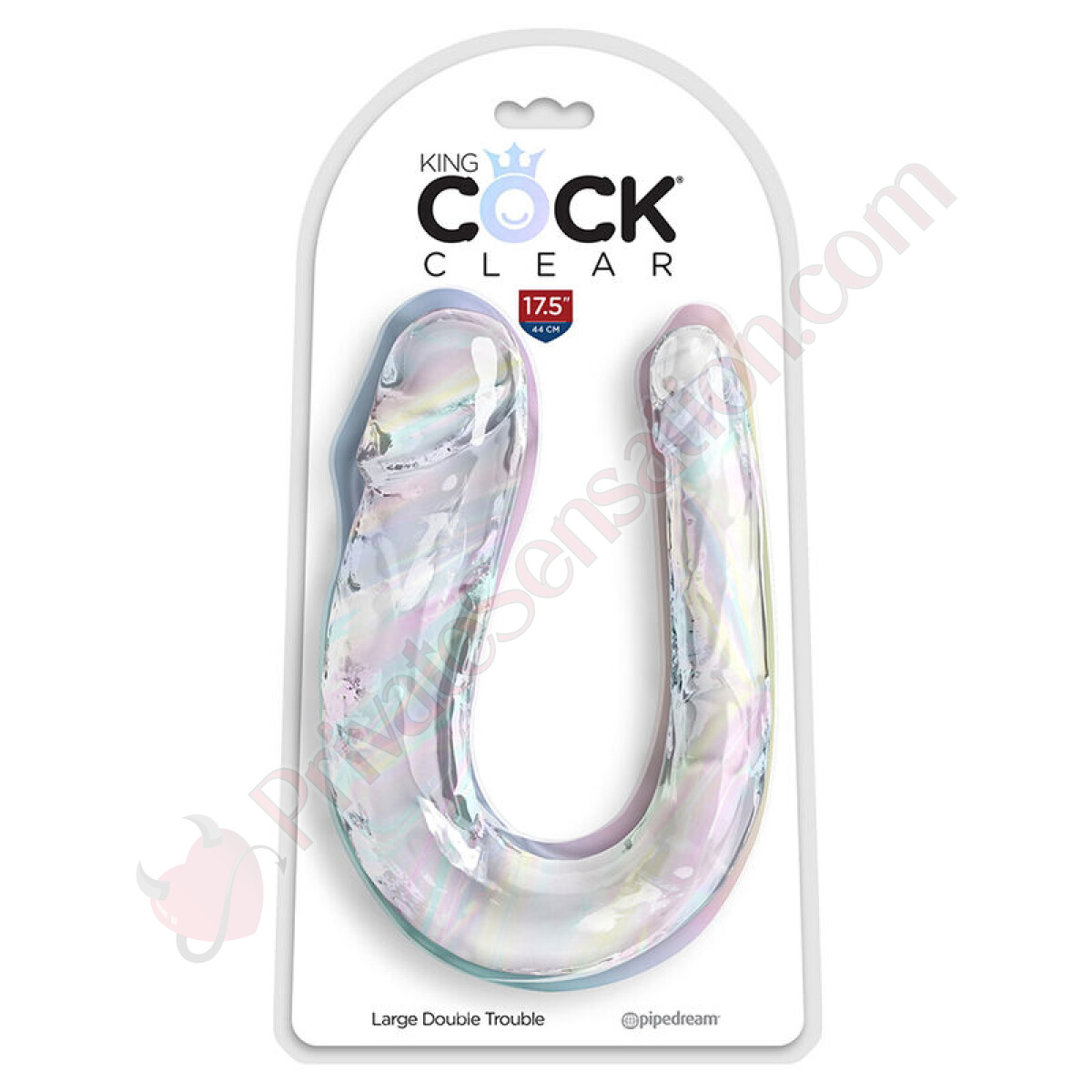 Il King Cock Clear Double Trouble Dildo combina un dildo doppio trasparente con un design realistico del pene, caratterizzato da un'asta flessibile, vene dettagliate e una testa definita.