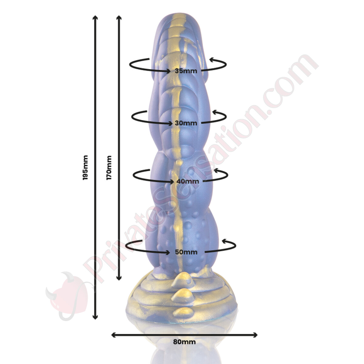 Il corpo del dildo è caratterizzato da diversi spessori lungo la sua lunghezza. Inizia con un diametro di 35 mm sulla punta e aumenta gradualmente fino a 50 mm nella parte inferiore. Questa conformazione permette un inserimento graduale. La base larga di 85 mm garantisce una presa stabile durante l'utilizzo.