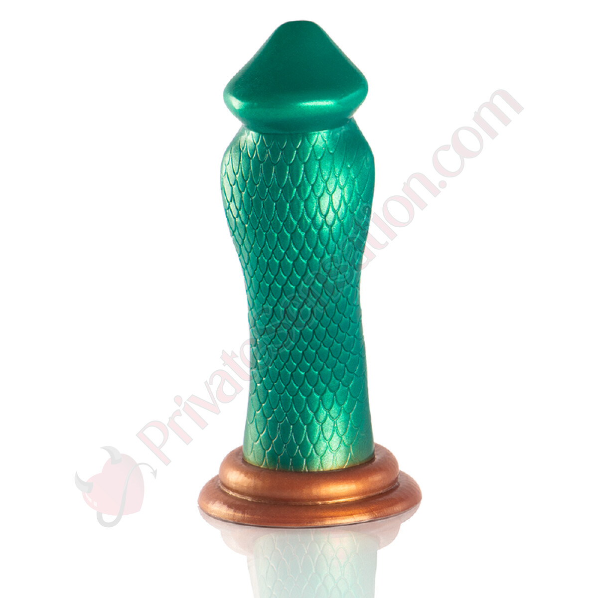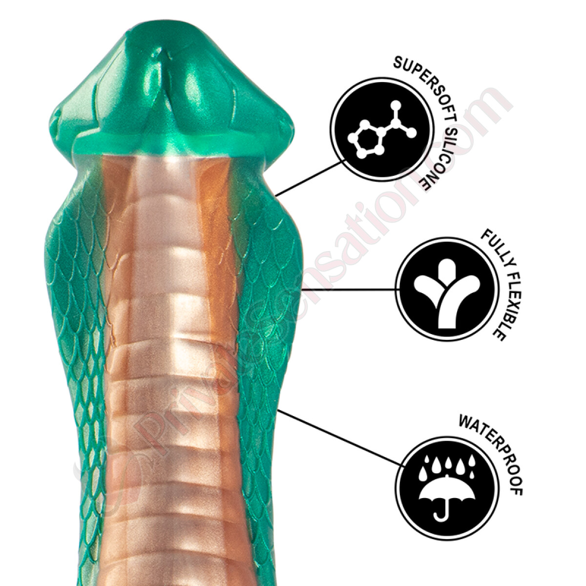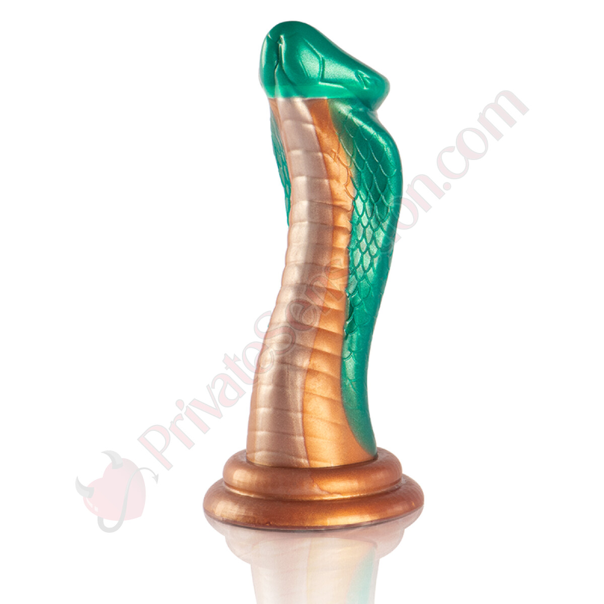 Questo dildo è realizzato in silicone e si distingue per il suo colore verde che richiama la pelle di un cobra e per la sua forma a diametro variabile. La struttura è progettata per offrire sensazioni differenti lungo tutta la sua lunghezza, con una base ampia che ne facilita l'utilizzo.