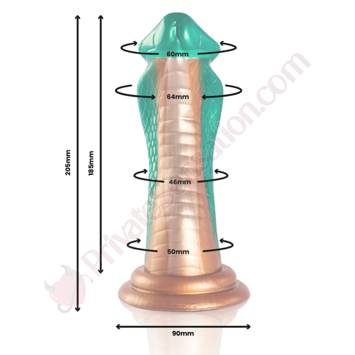 La forma del dildo presenta diversi spessori per una stimolazione progressiva. La punta, con un glande di 60 mm, è seguita da un rigonfiamento di 64 mm. La parte centrale si assottiglia a 46 mm per poi allargarsi nuovamente a 50 mm verso la base, creando un profilo dinamico. La base di 90 mm garantisce una presa sicura e stabilità.