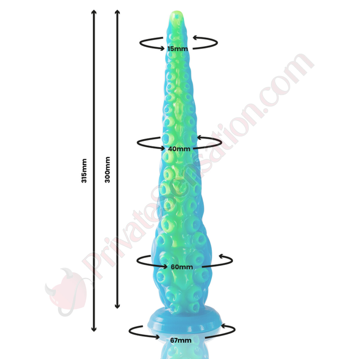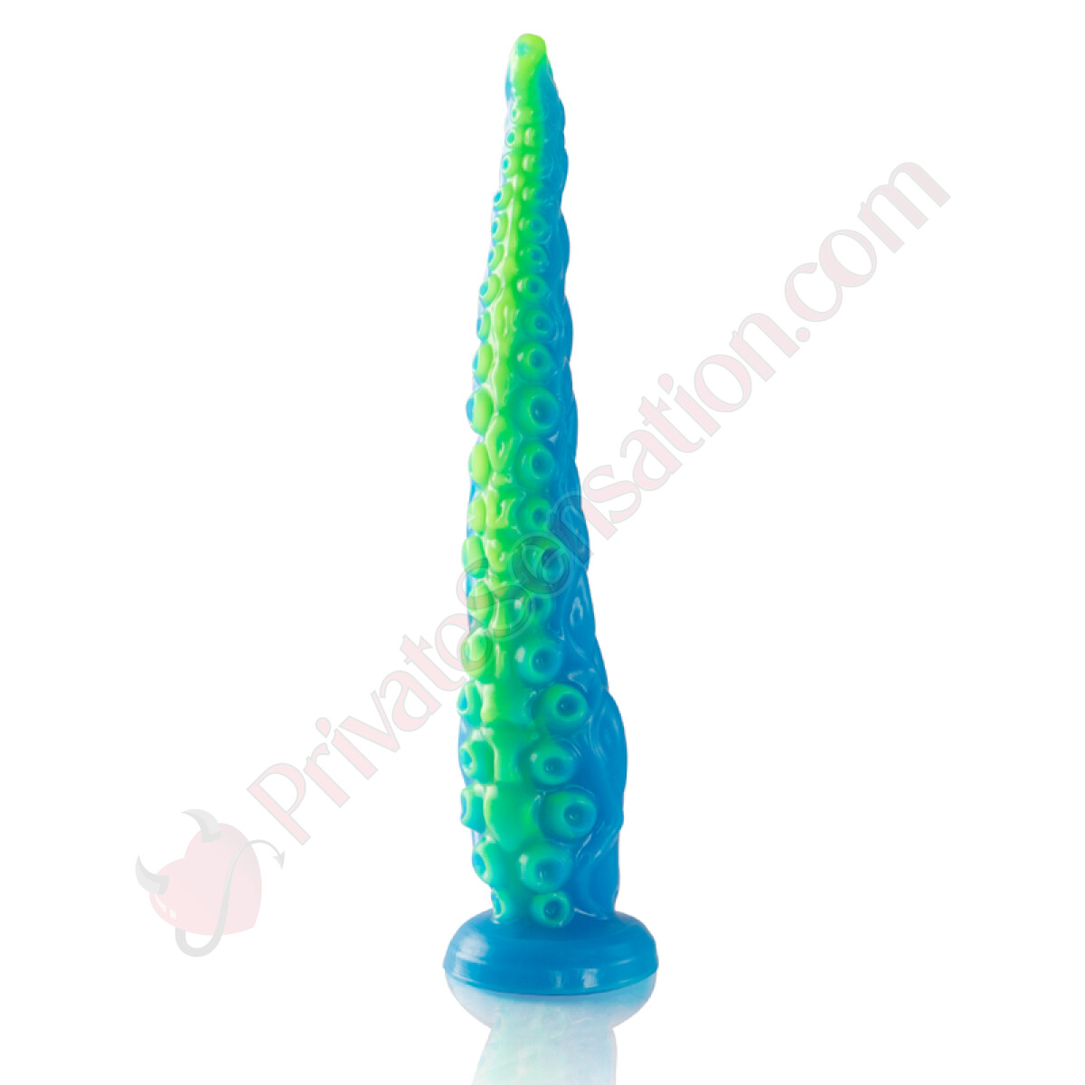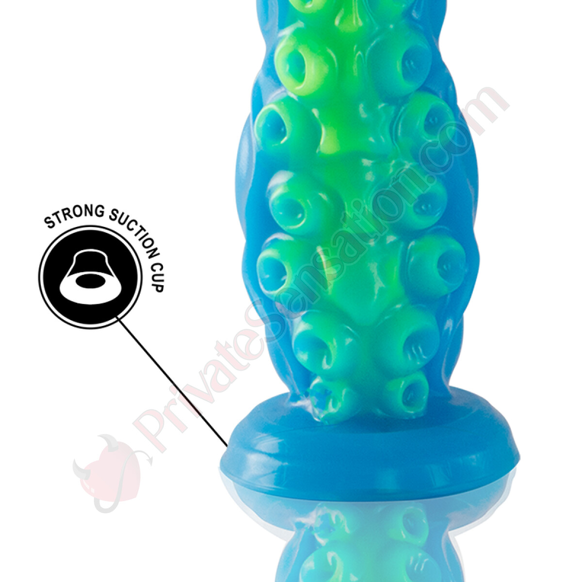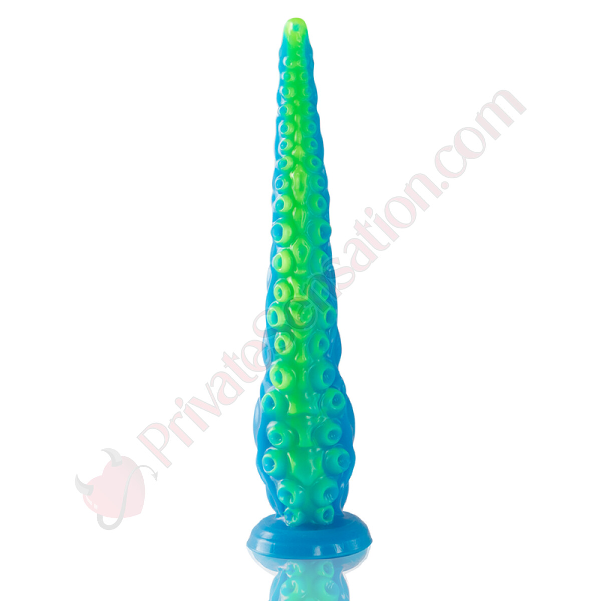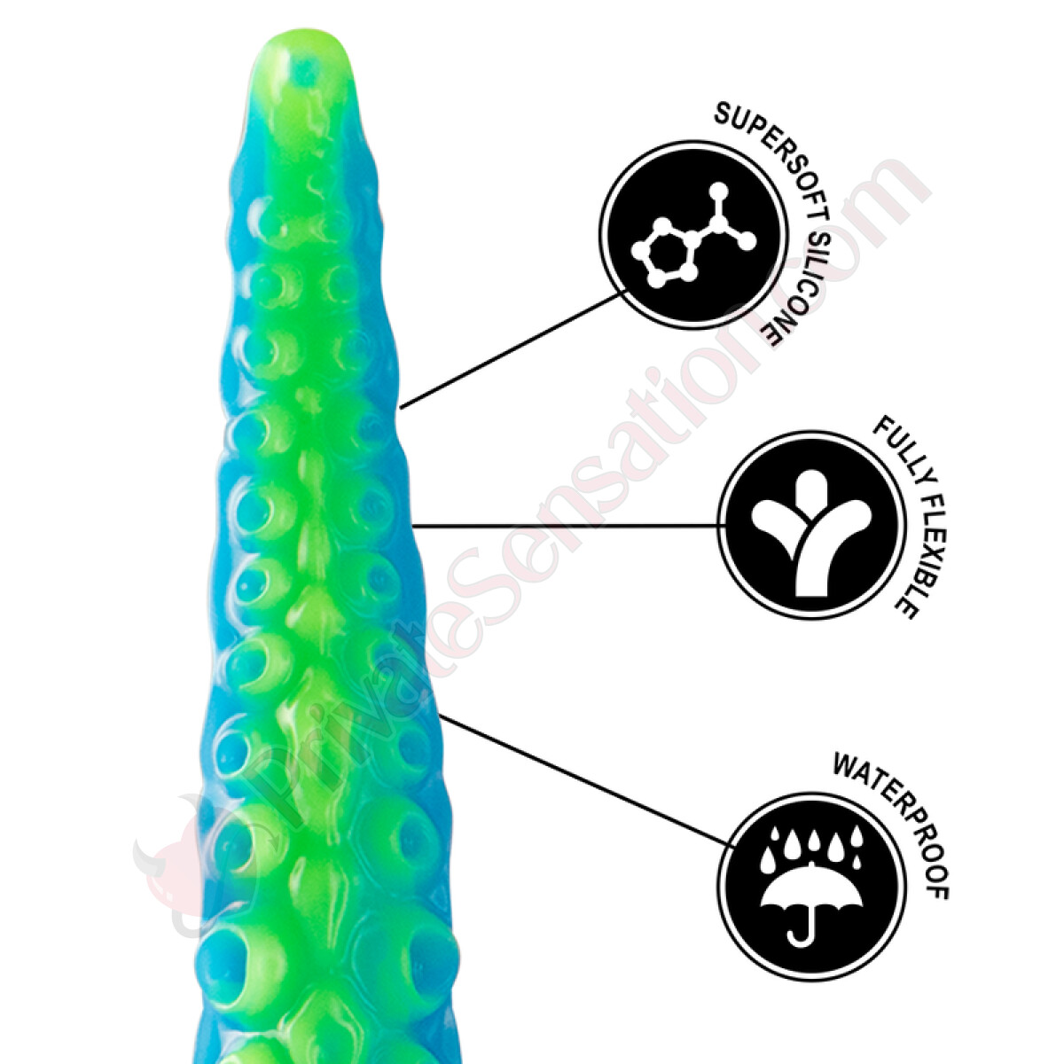 Questo dildo è realizzato in silicone e presenta una forma ispirata a un tentacolo, con un effetto fluorescente. La sua struttura è caratterizzata da una punta sottile che aumenta gradualmente di diametro lungo il corpo, per poi terminare con una base stabile che ne facilita l'utilizzo e la presa.