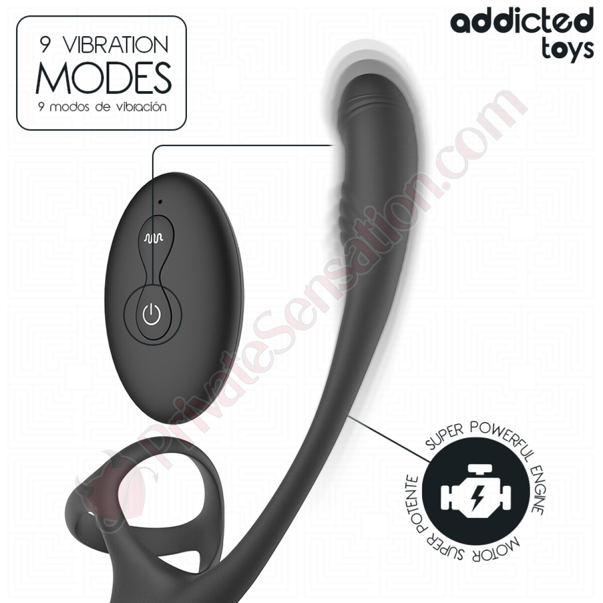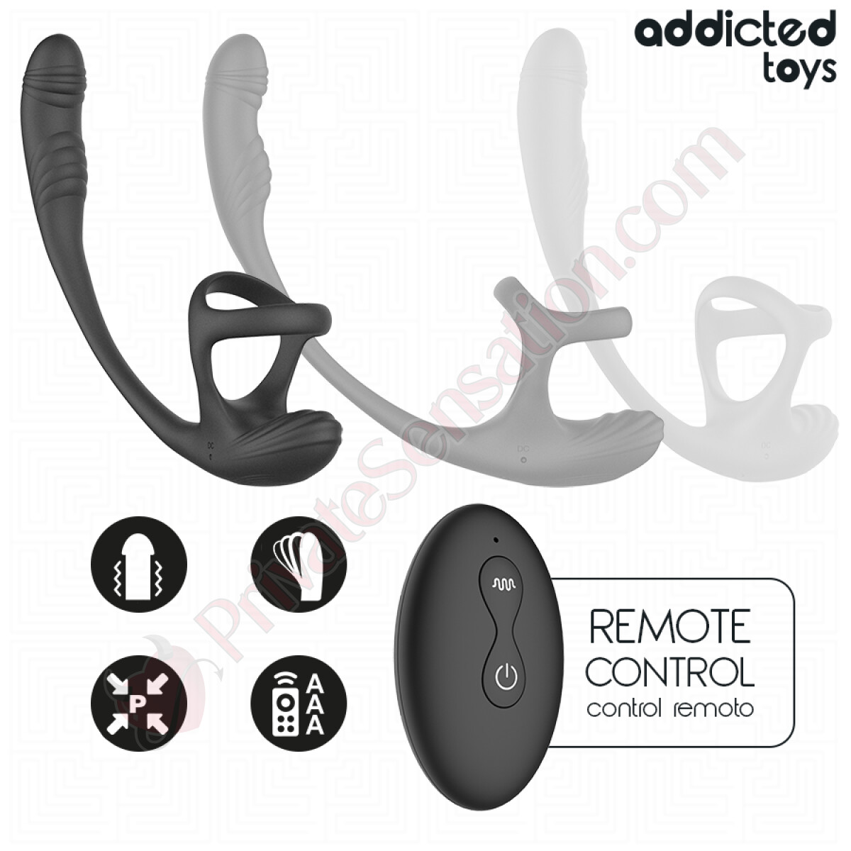 This device combines three elements for a diverse male stimulation. Its design integrates a ring for the base of the penis and testicles, a textured base, and a prostate stimulator, all designed to work simultaneously to enrich the experience.