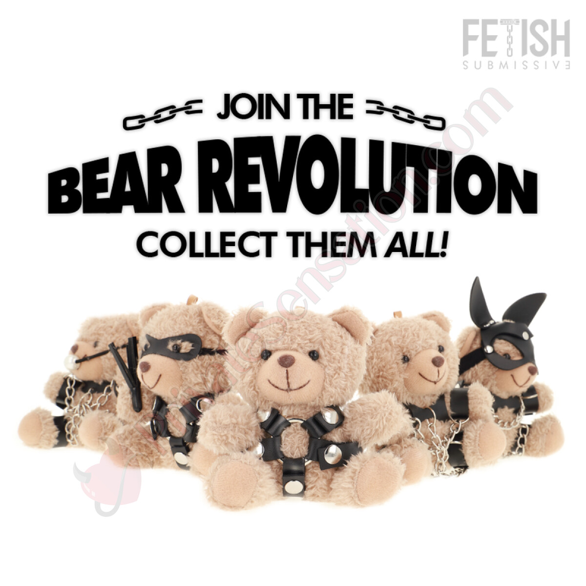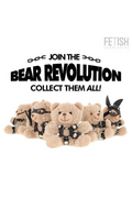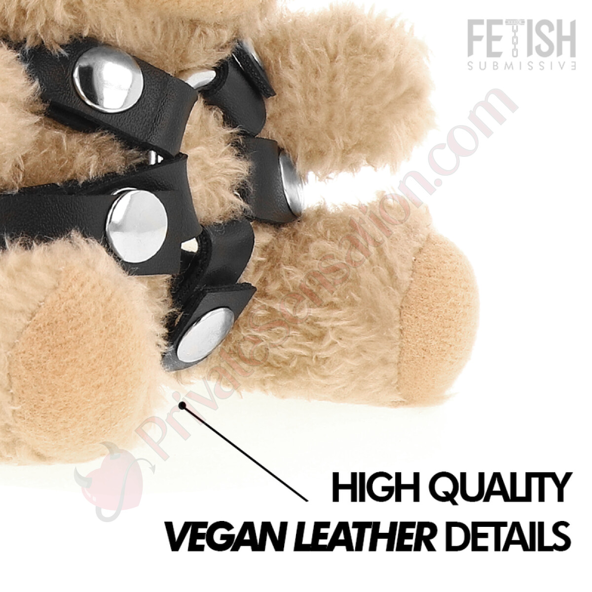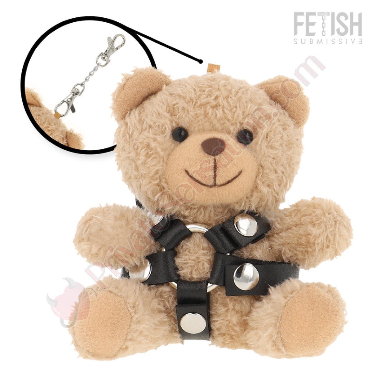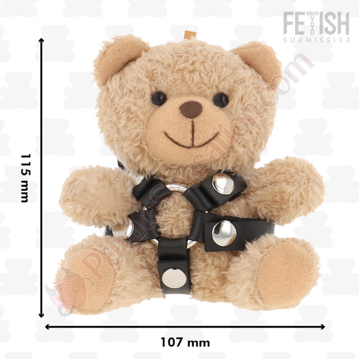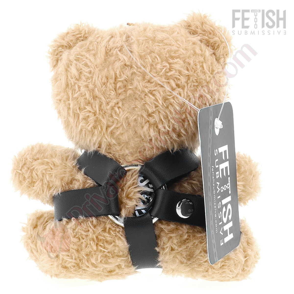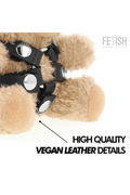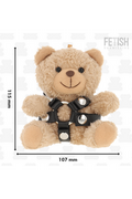 This model, Bongo, wears an elegant harness with a central o-ring. The accessories that characterize these plush toys, such as the harnesses, are made with soft faux leather and lace straps, tailored to the bear's figure. The design is crafted to create a visual contrast between the plush body and the edgier details.