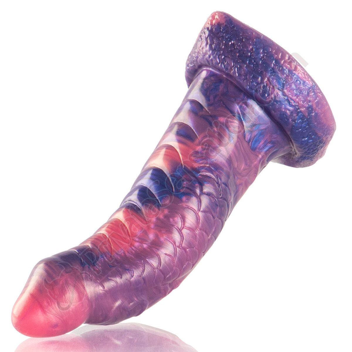 This dildo is made of silicone and features a structured shape with varying diameters. The design is characterized by a progression of thickness along the shaft, starting from a narrower tip and widening to a larger central section, designed to offer gradual and intense sensations.