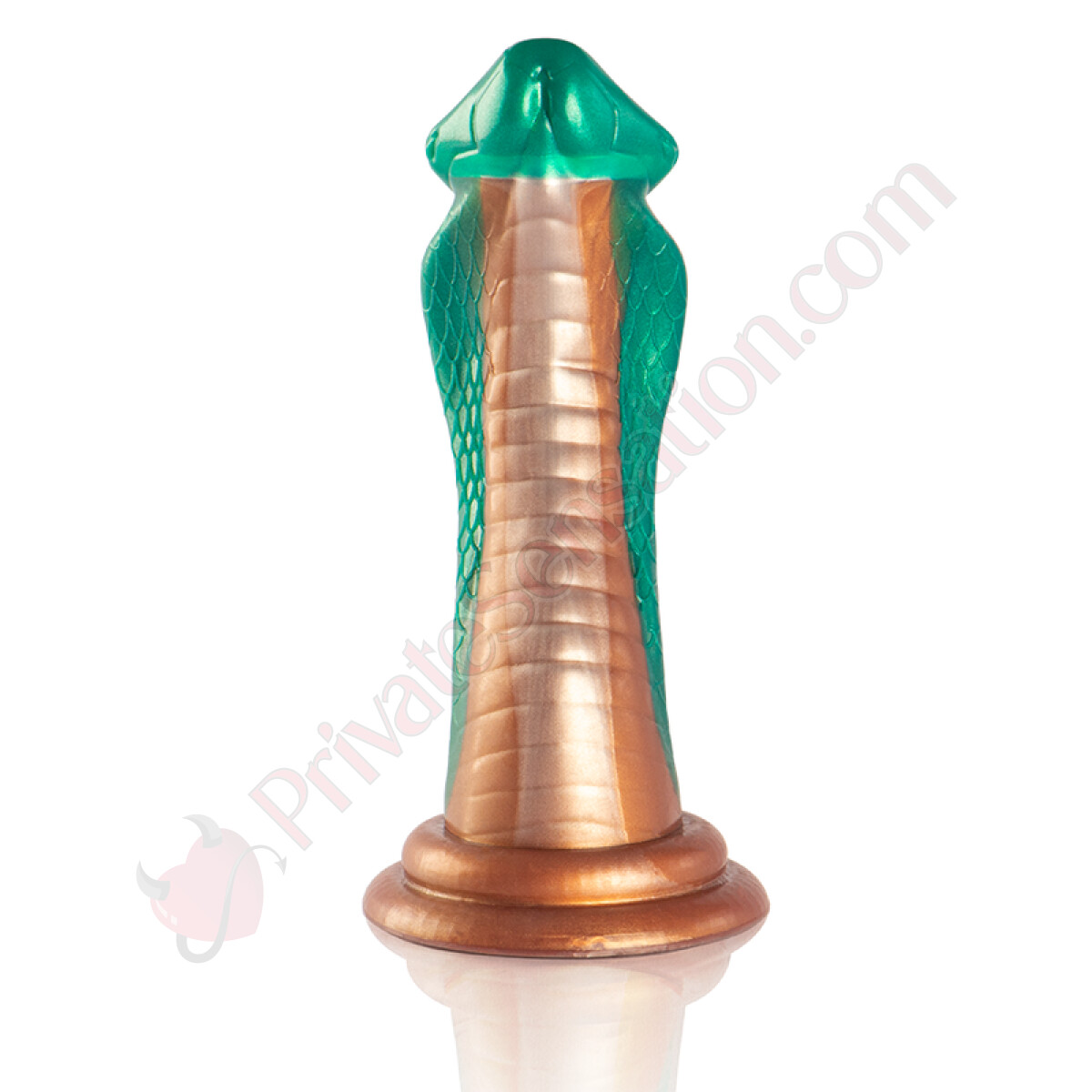 This dildo is made of silicone and stands out for its cobra-green color and variable-diameter shape. The structure is designed to offer different sensations along its entire length, with a wide base for ease of use.