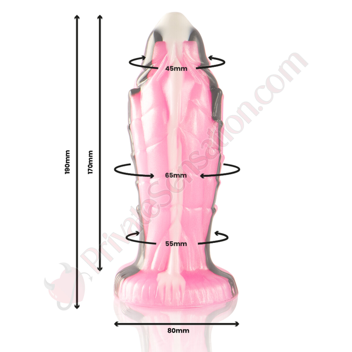 The dildo has a 45 mm glans, followed by a thicker 65 mm upper section and a 55 mm middle part. This variation in diameter along the shaft creates a fulfilling experience. The 80 mm wide base ensures a stable grip and secure use. Made entirely of silicone, it provides a smooth and consistent surface.