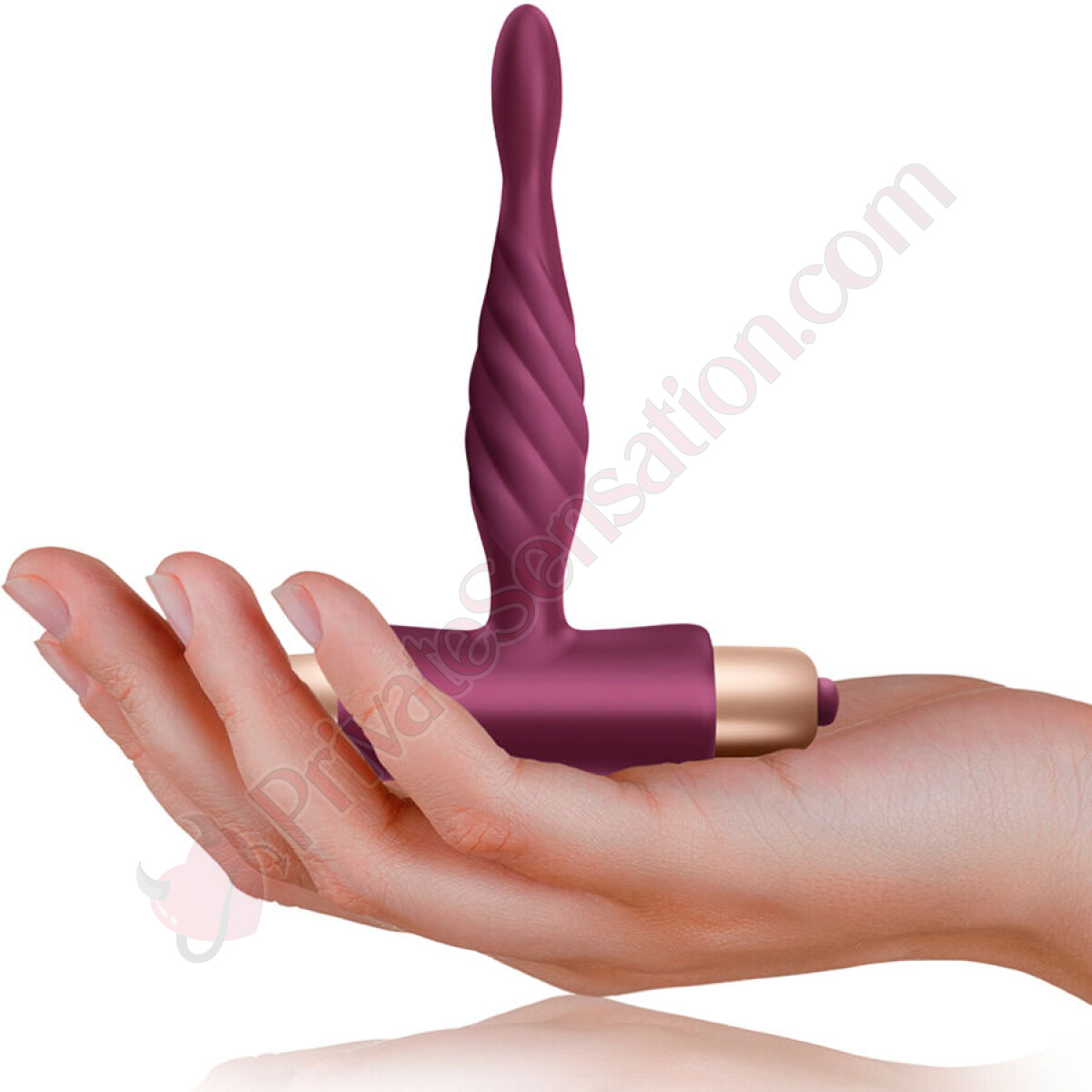 The vibrator features a twisted design on its surface to offer varied stimulation, while the anal plug has a tapered shape and a wide base for comfortable insertion and use. Both components are made of silicone and ABS plastic, materials that are smooth to the touch.