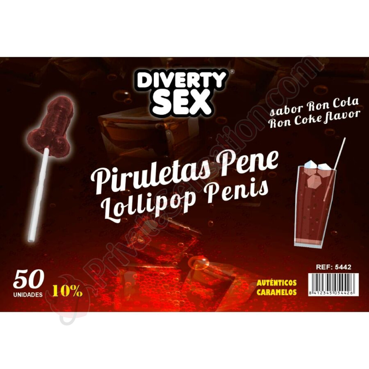 Are you ready to experience a delicious treat that defies all conventions? DIVERTY SEX's Penis-Shaped Lollipops with Rum Cola Flavor and 10% Alcohol are not just candies: they are a statement, an anthem to carefree fun and unfiltered pleasure. Imagine the surprise in your friends' eyes when you unveil these bold delights, perfect for those who aren't afraid to dare and laugh out loud.
