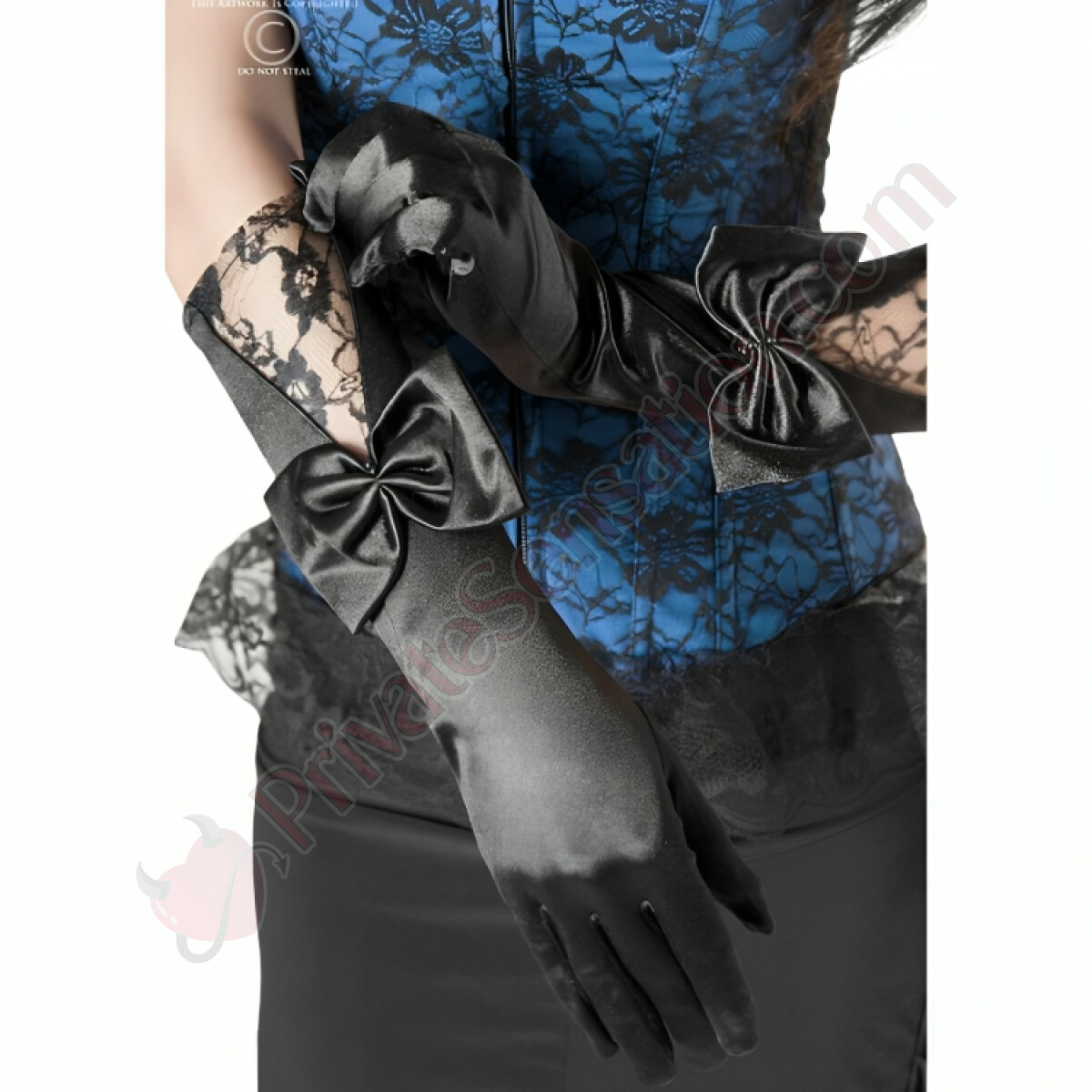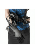 Crafted from the finest black satin, these gloves glide over the skin like a caress, offering a feeling of pure tactile pleasure. The intricate lace details and the black bow adorning the top add a touch of intrigue and refinement, turning an accessory into a wearable work of art. The artisanal quality is evident in every stitch, ensuring comfort and durability over time.