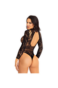 The high neckline creates an aura of impeccable refinement, framing your décolletage with discreet elegance. The long lace sleeves contour like a second skin, delivering a sleek and sophisticated visual effect. But it's in the back where this bodysuit reveals its most daring soul: the strategic mesh opening offers a calculated play of seduction, revealing glimpses of skin with breathtaking effect.