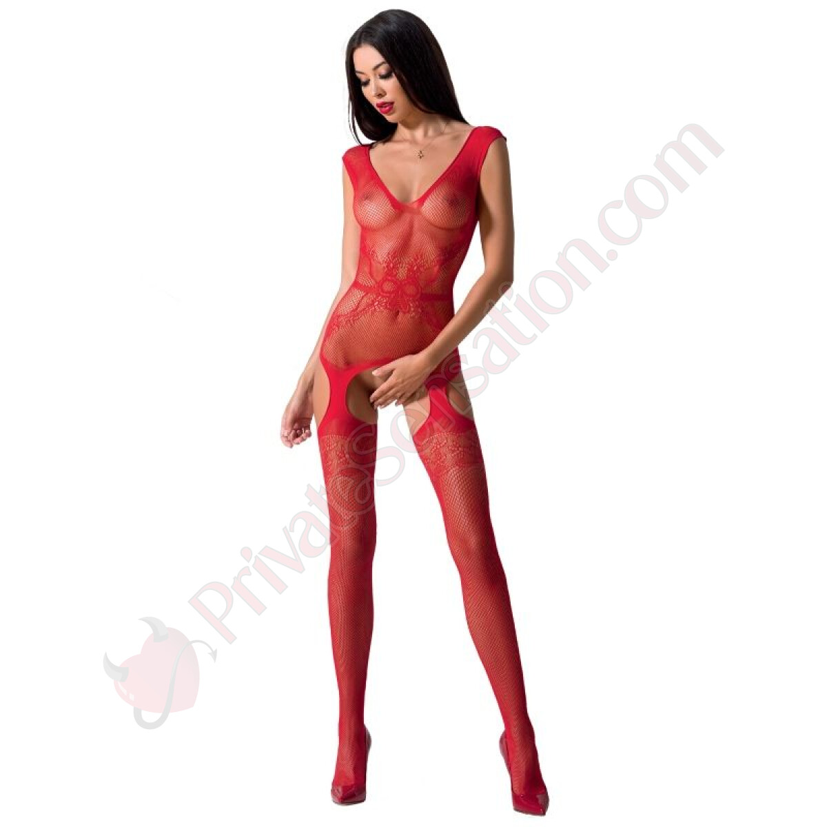 The main mesh body offers a studied transparency, playing with light and shadow to create a breathtaking effect. The distinctive feature is the strategic opening in the crotch area, a daring detail that adds a touch of sophisticated provocation, making the garment both practical and incredibly sensual.