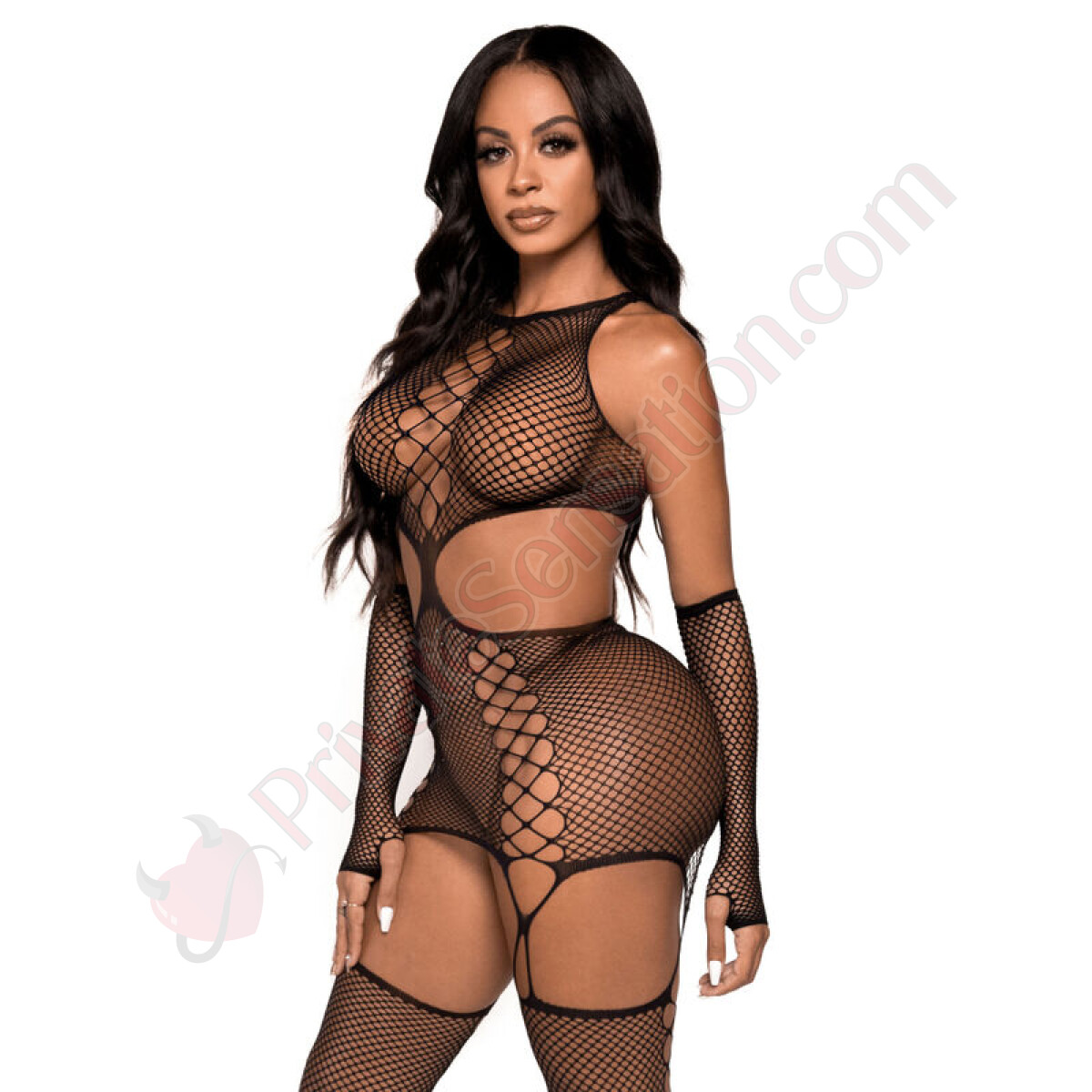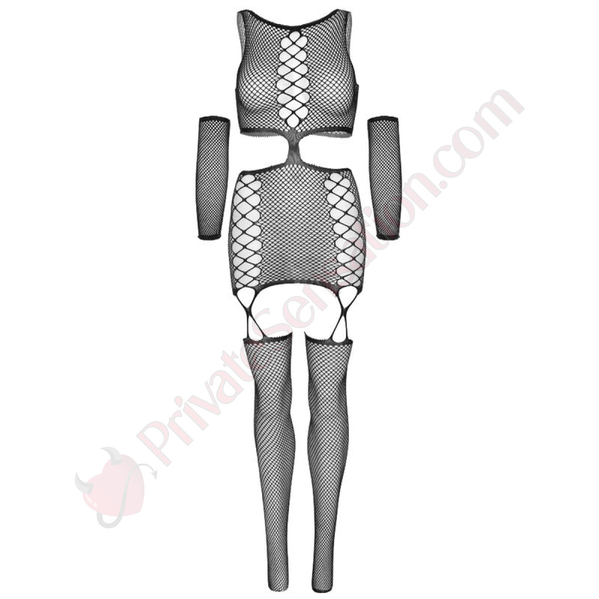 Imagine wearing a mini dress garter in mesh, perfectly interlaced to shape your curves with grace. The set includes: