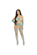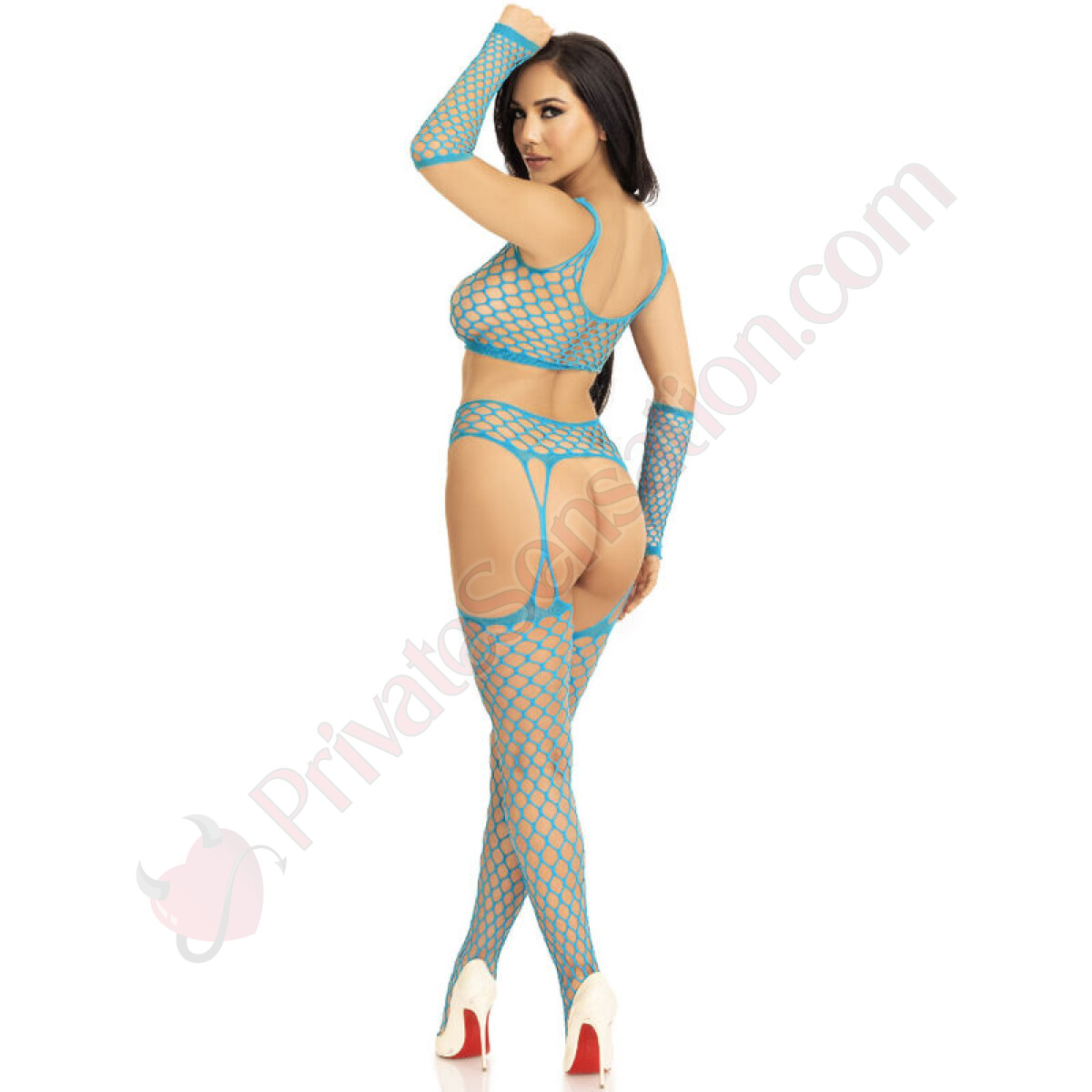 The matching gloves complete the set, adding an element of elegance and coquetry. Made from the same mesh material as the top and stockings, the gloves perfectly complement the ensemble, providing a unique and irresistible style element.