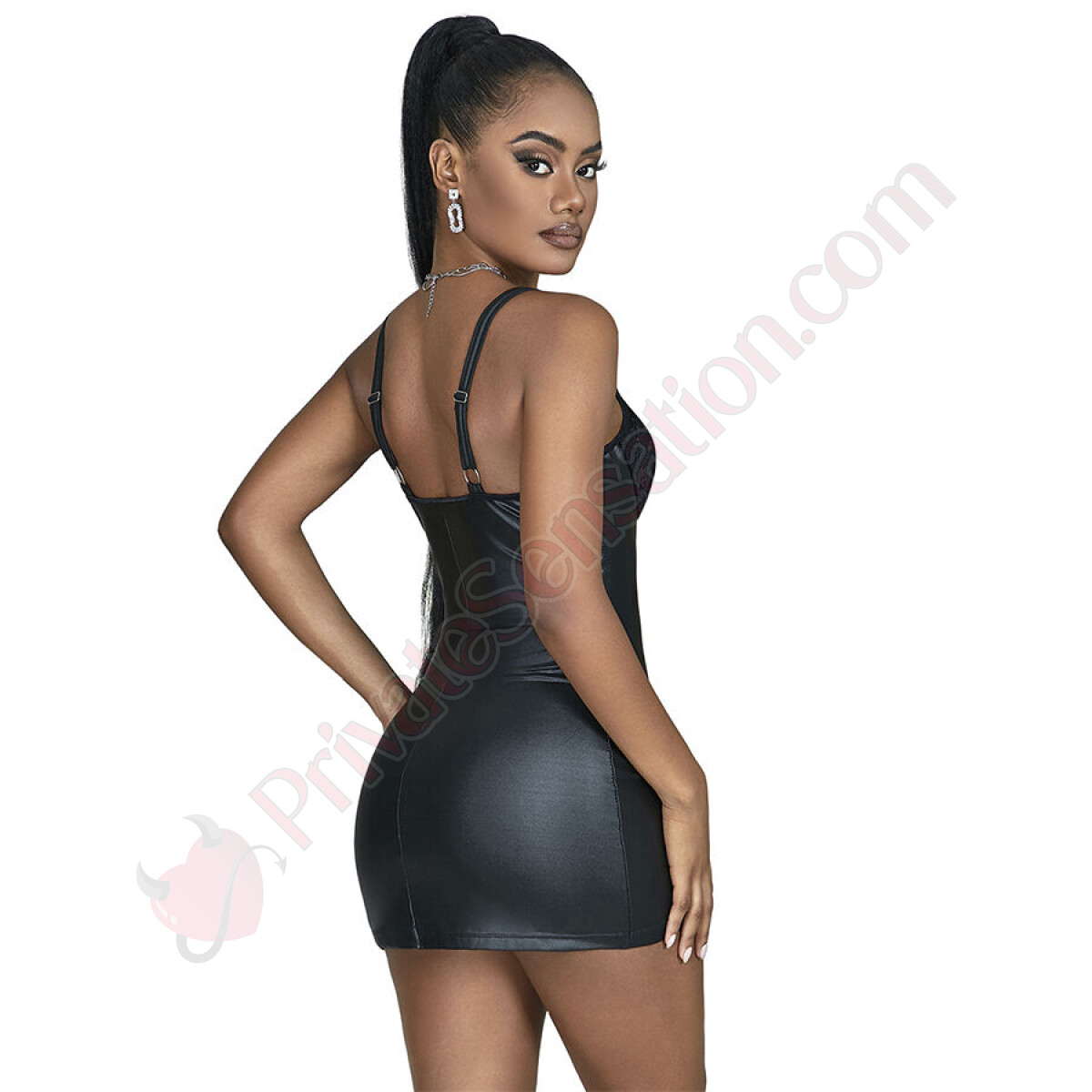 The front zipper is the heart of this bold design. Not only does it add an element of playfulness and seduction, allowing you to adjust the opening for an even more provocative look, but it also symbolizes strength and determination. The strategic lace transparencies reveal skin in a subtle and refined way, while the vinyl-effect material infuses an air of sophisticated rebellion.