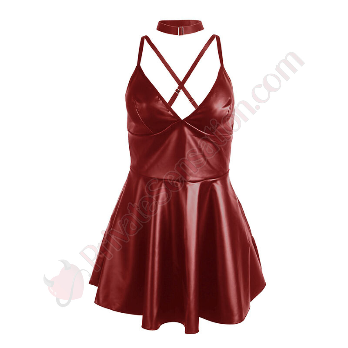 Meticulously crafted with attention to detail, this nightgown combines breathtaking aesthetics with exceptional comfort. The composition of 95% polyester and 5% elastane ensures an ultra-soft texture, optimal elasticity, and a perfect fit to the body, like a second skin. The synthetic leather (PU) finish in burgundy adds a touch of visual and tactile luxury, creating a glossy and refined effect that immediately catches the eye.