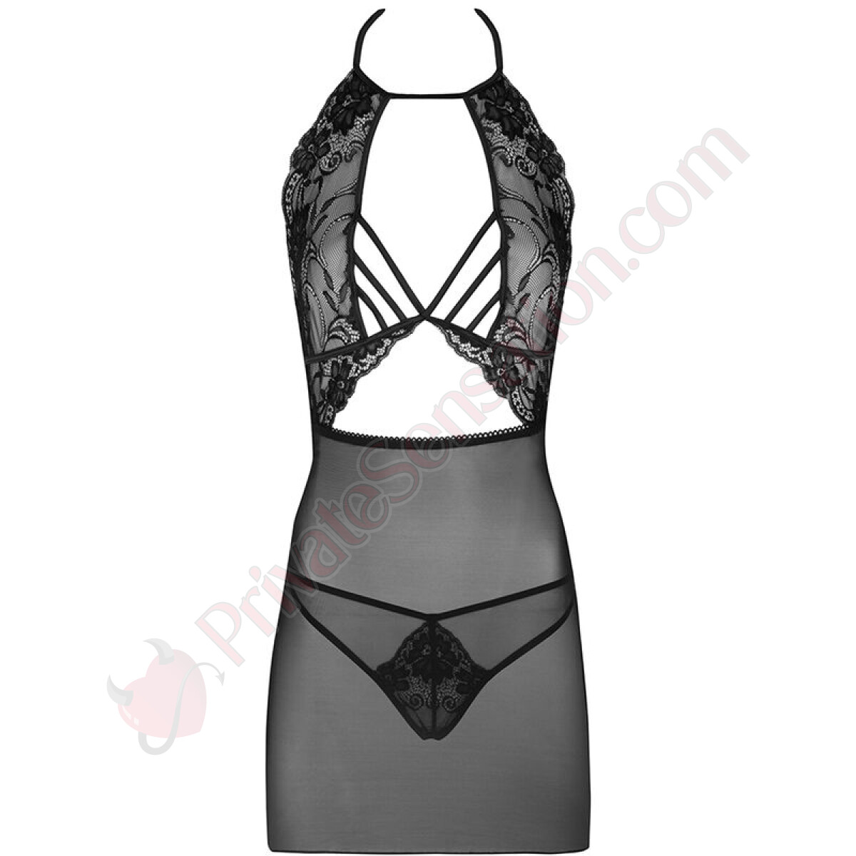 The camisole features an impressive combination of classic materials, with sensual straps that support the bust and add character. The upper part is made of feminine lace, while the lower part is dense mesh reaching mid-thigh. With both front and back décolletage, beneath the semi-transparent material you can glimpse an originally cut thong with lace inserts and straps that wrap around the buttocks.