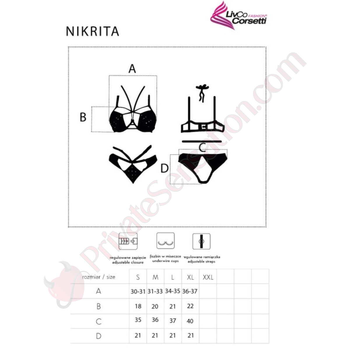 Made from durable and flexible materials, the Nikrita set ensures a perfect fit and all-day comfort. Both the bra and panties feature adjustable straps and bands, allowing you to customize the fit to your needs. Available in sizes S to XL, it's ideal for all women seeking a piece that combines style and practicality.