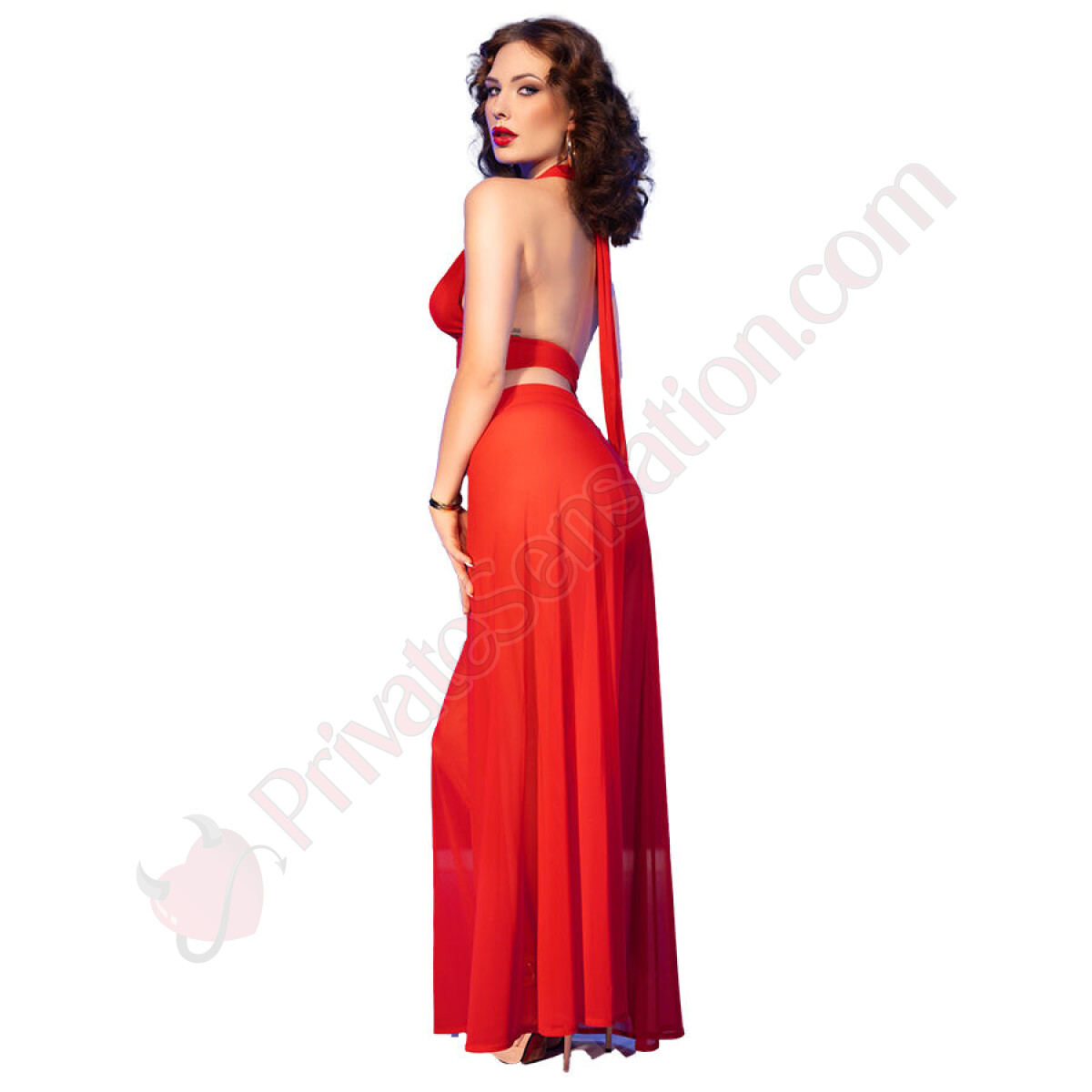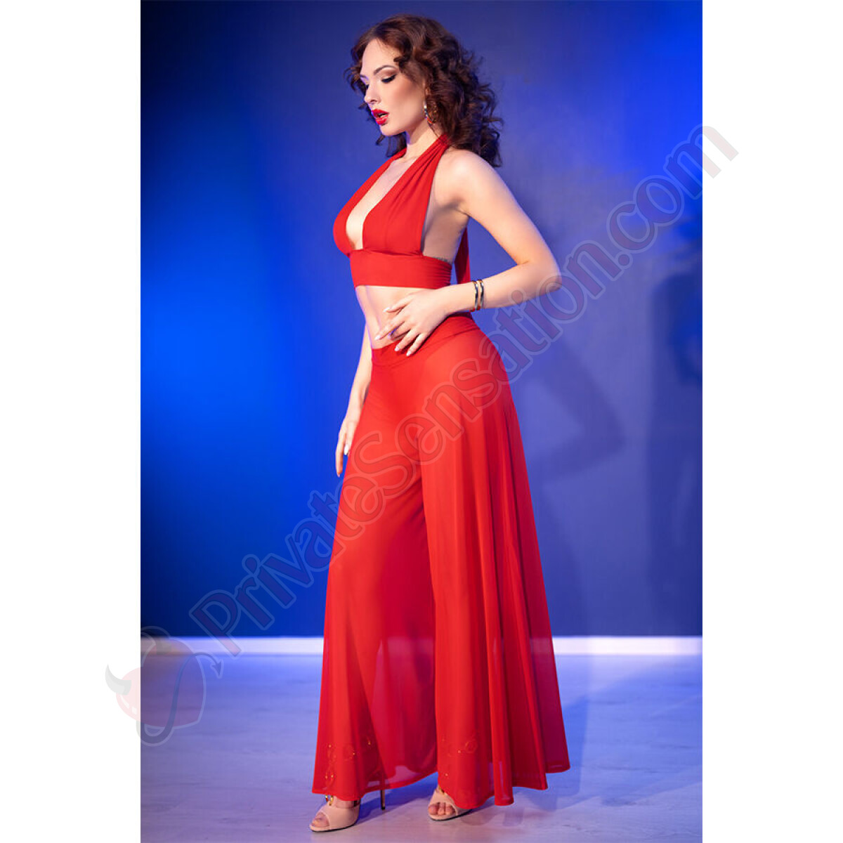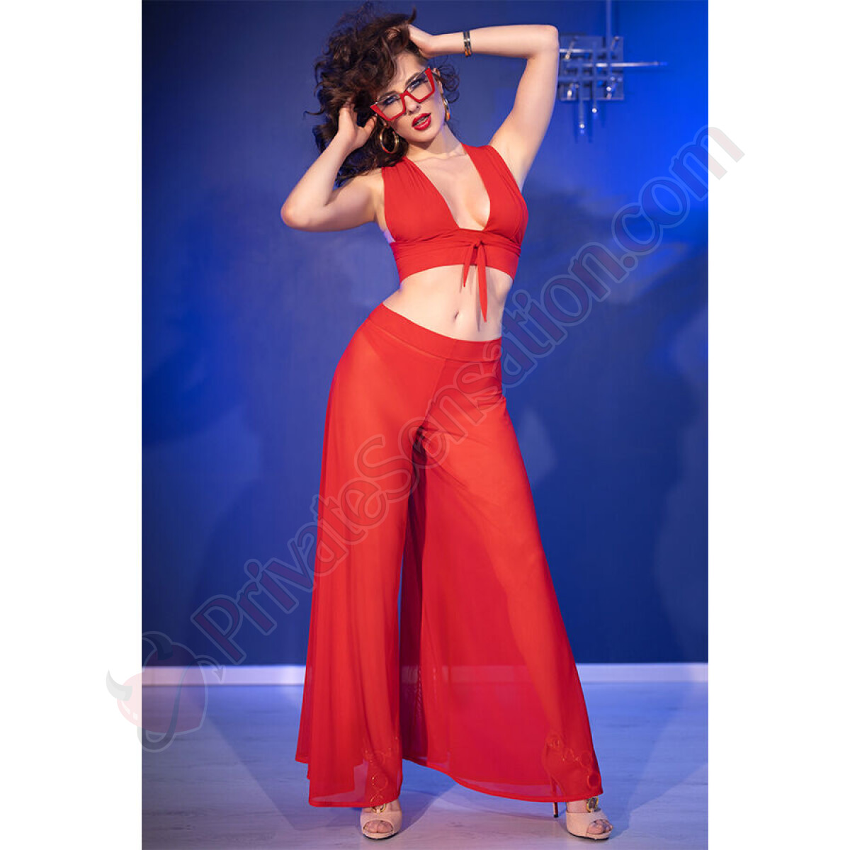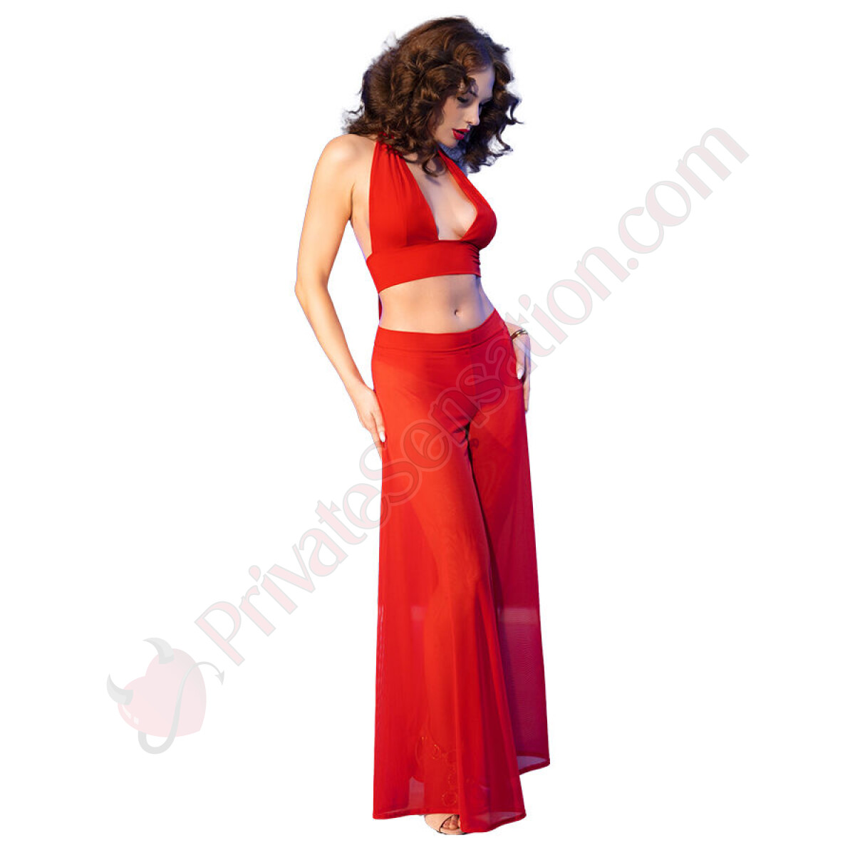 The wide pants add a touch of refinement to the set, wrapping the body with a fluid and sensual silhouette. The lightweight fabric moves with you, creating an elegant effect that doesn't go unnoticed. Ideal for special evenings or intimate moments, these pants enhance your curves without sacrificing comfort.