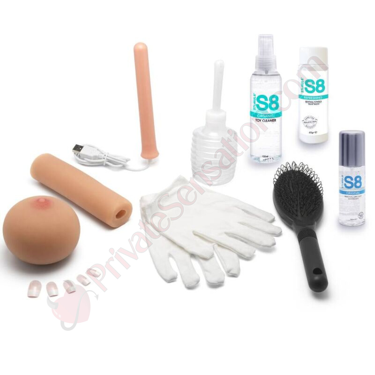 The product comes with a complete set of accessories for care and maintenance. The package contains two sets of lingerie, a material cleaner, a lubricant, a renewal powder, cotton gloves, a spare set of nails, a USB heating rod, a cleaning irrigator, and a hairbrush.
