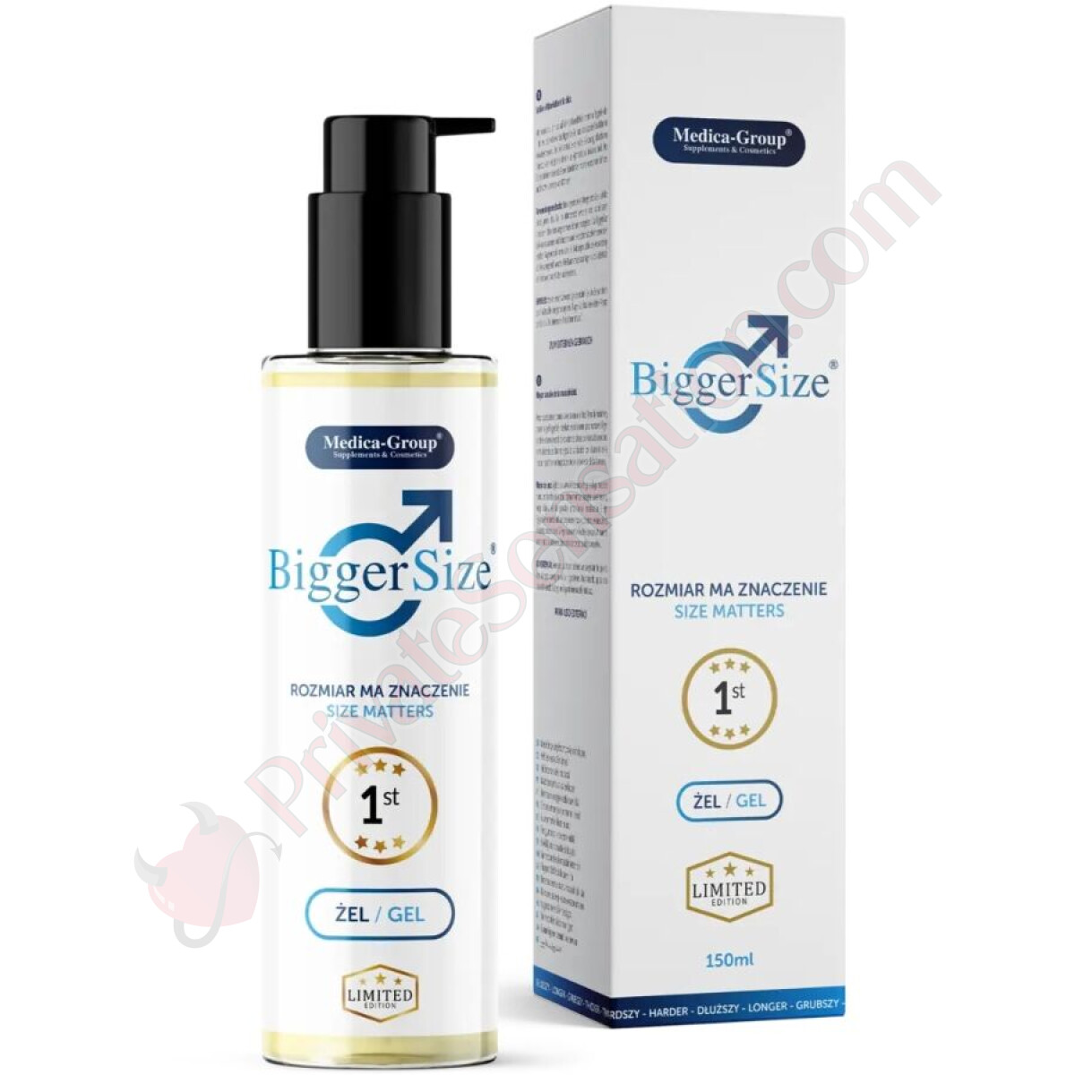 BiggerSize Gel is produced by MEDICA-GROUP, a company with over twenty years of experience in the dietary supplement and cosmetics sector. All products meet strict European standards, guaranteeing maximum quality and safety. Store the product in a dry place, away from direct sunlight and out of reach of children.