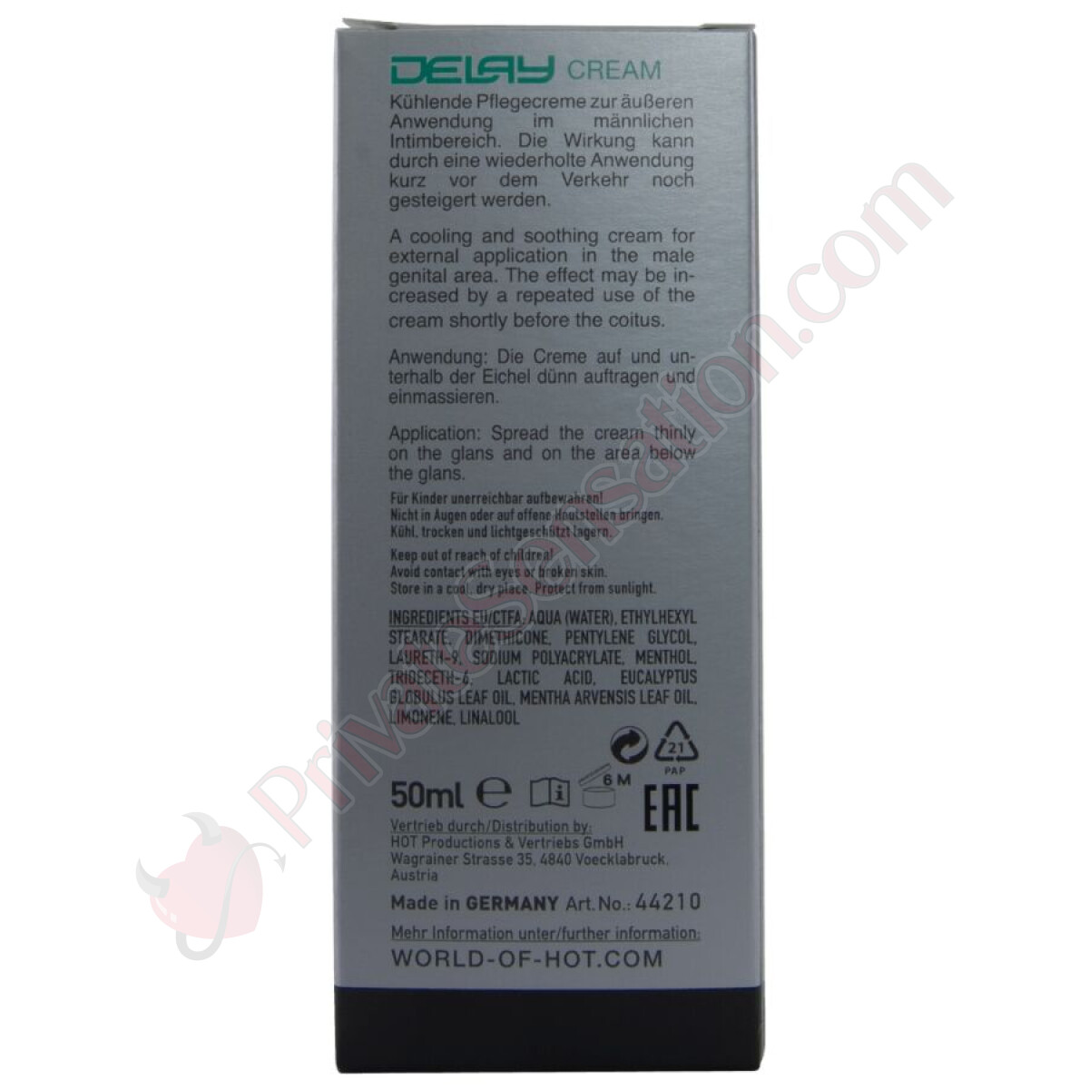 Our delay cream is formulated with selected ingredients to ensure effectiveness and safety: Water, ethylhexyl stearate, dimethicone, pentylene glycol, Laureth-9, sodium polyacrylate, menthol, Trideceth-6, lactic acid, eucalyptus leaf oil (Eucalyptus Globulus), mint leaf oil (Mentha Arvensis), limonene, pinene, linalool, beta-caryophyllene, terpineol, carvone, terpinolene.