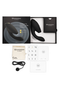 Package Contents: Womanizer DUO 2 Dual Stimulator, USB charging cable, two stimulation heads, cotton storage bag, quick start guide, safety instructions.