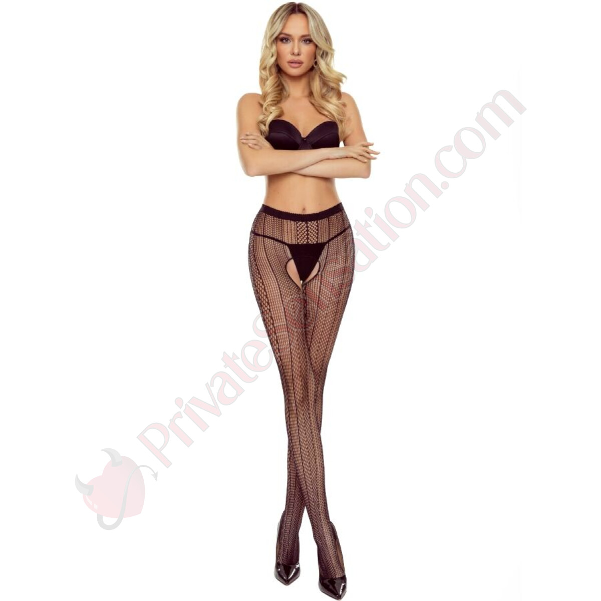 L'elemento più distintivo di questo modello è la zona intima aperta (crotchless), progettata con cura per aggiungere un tocco audace senza rinunciare allo stile né all'eleganza. Questa apertura strategica non solo aggiunge una componente altamente erotica, ma rende queste calze un capo ideale sia per stupire in occasioni speciali sia per elevare l'esperienza nell'intimità senza doverle rimuovere.