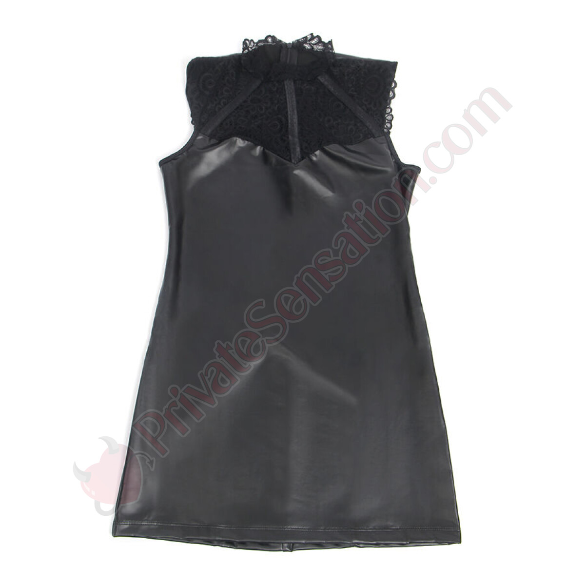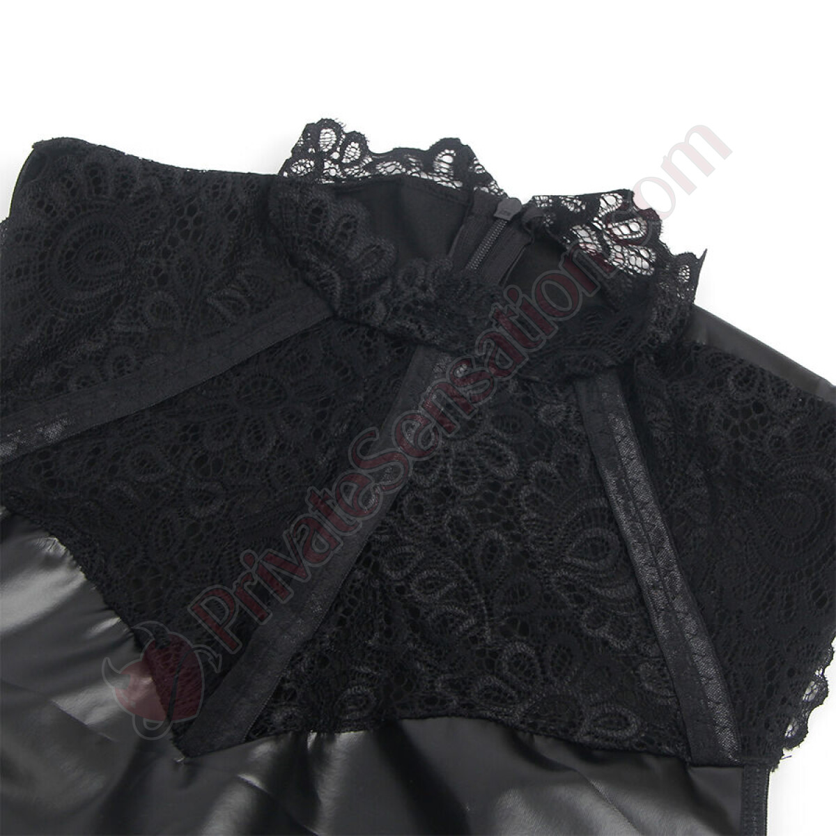 Questo spettacolare design unisce l'eleganza del pizzo floreale all'impatto visivo della pelle sintetica (PU leather), creando un contrasto irresistibile tra delicatezza e audacia. Il materiale con effetto vinile aggiunge un tocco seducente e ribelle, mentre i dettagli in pizzo donano femminilità e raffinatezza.