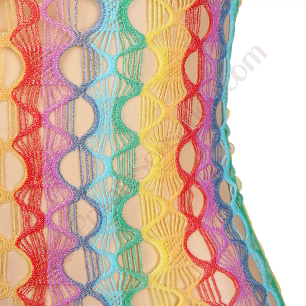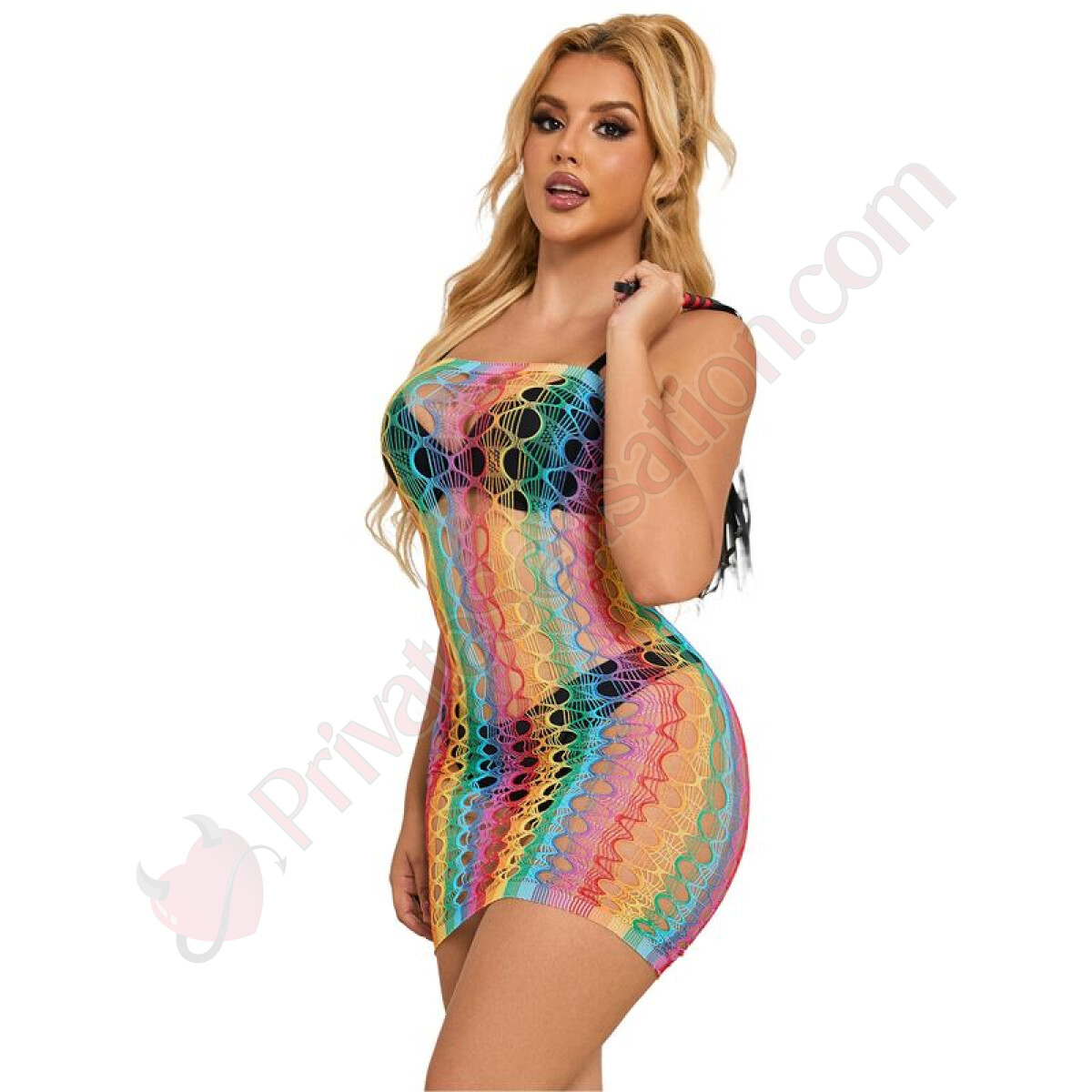 Questo body con spalle scoperte sfoggia un design a reticolo arcobaleno, un dettaglio audace e affascinante che cattura la luce e l'attenzione. Ogni intreccio è studiato per esaltare le tue curve, regalando un look sofisticato e provocante.