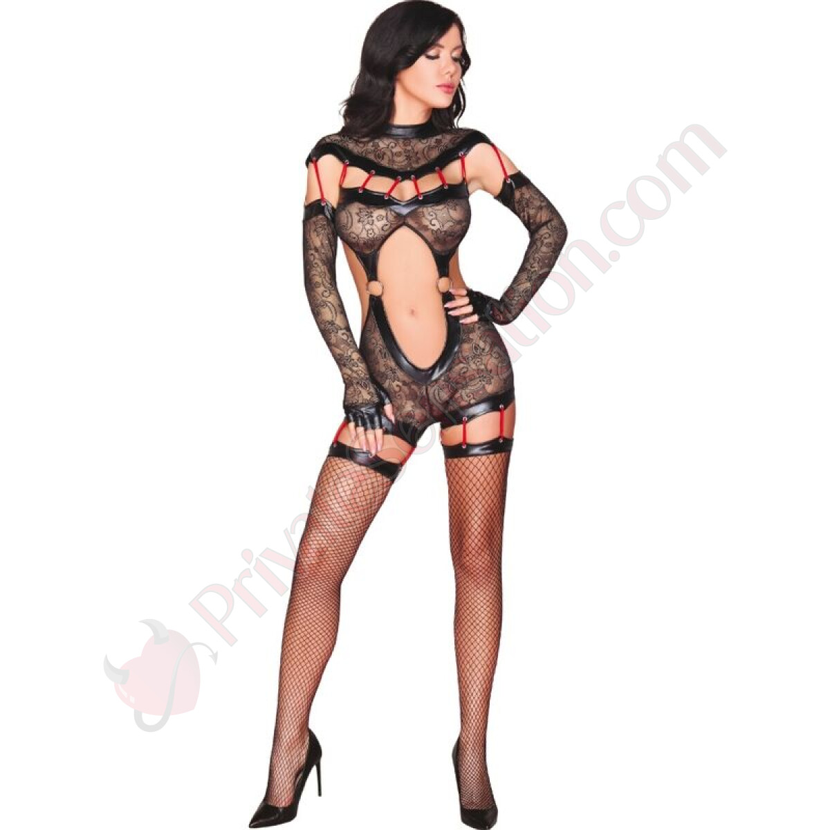 Questo straordinario mono di una pezza con guanti lunghi, chiuso da una zip sulla schiena, è realizzato in intricato pizzo nero e lattice. Gli accessori rossi a forma di lacci nella parte superiore e inferiore lo rendono stravagante e unico. All'altezza del ventre, è collegato con due anelli di metallo, aggiungendo un tocco audace e moderno. Le calze a rete sono connesse al mono tramite lacci rossi, creando un insieme armonioso e seducente.