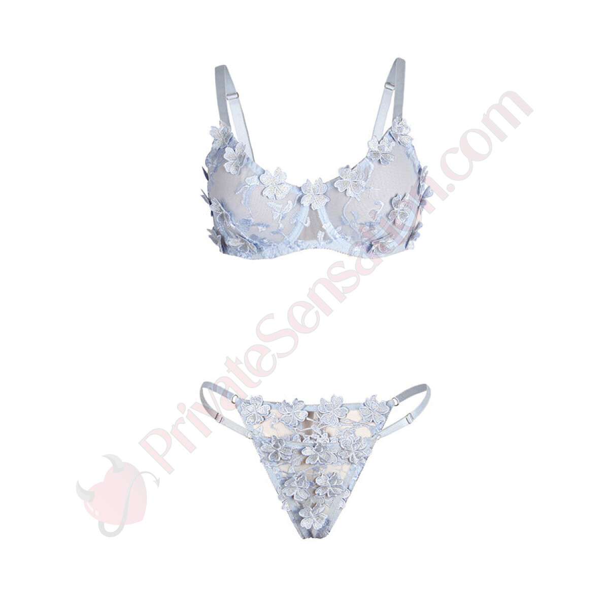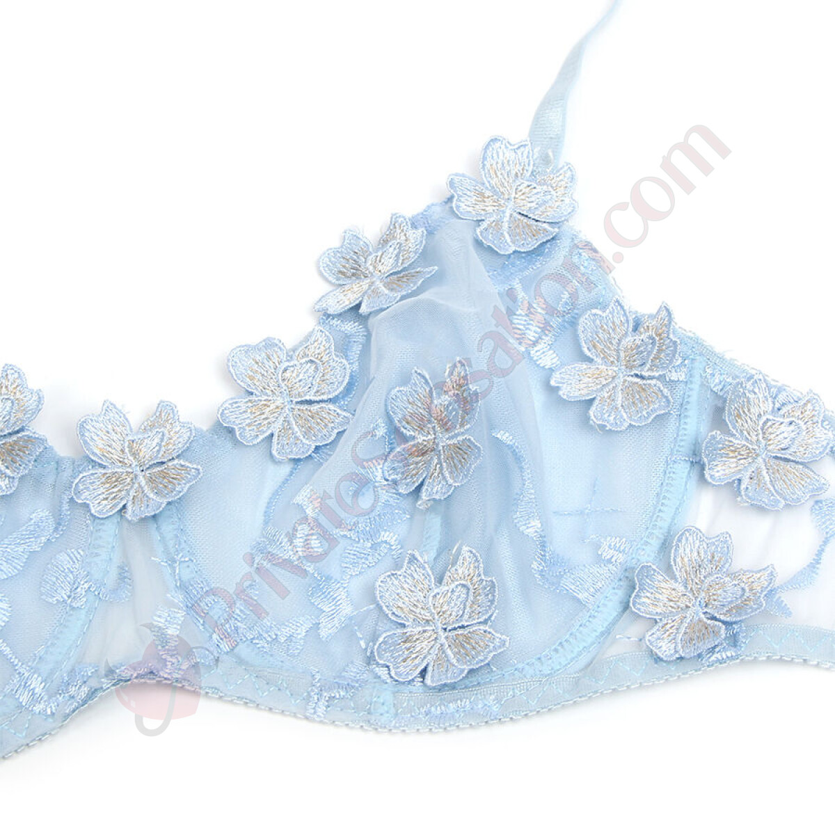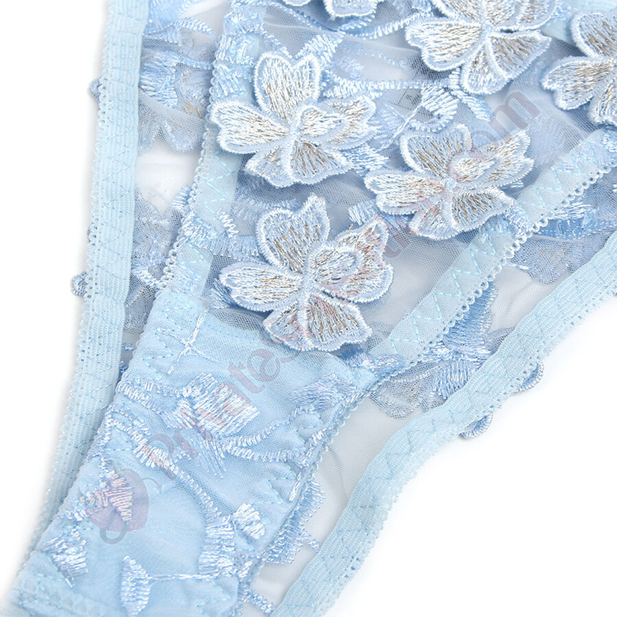 Questo esclusivo set in tonalità blu si distingue per la sua rete trasparente con ricami floreali, un design che unisce la raffinatezza del pizzo alla leggerezza del tessuto per un risultato etereo e irresistibile. Il reggiseno in pizzo, con coppe semi-trasparenti e dettagli ricamati, incornicia il décolleté in modo elegante, offrendo un sostegno delicato senza compromettere la sensualità. Le spalline regolabili e la chiusura posteriore assicurano una vestibilità perfetta e comoda per tutto il giorno.