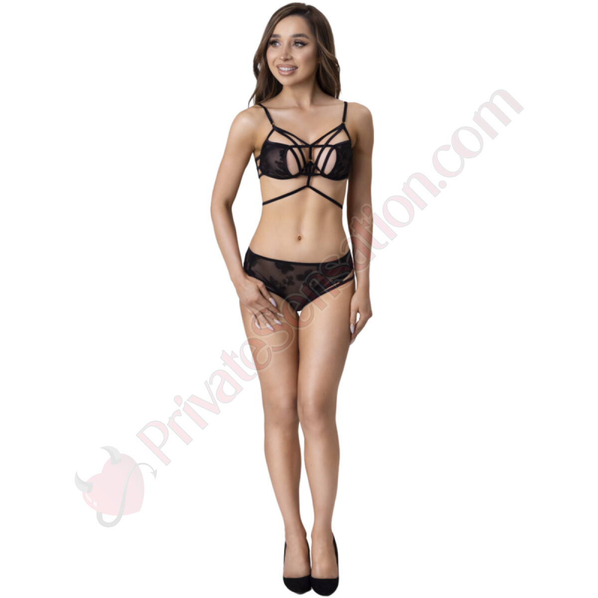 Realizzato in pregiatissimo pizzo con inserti in rete, il set Eliana sfoggia un colore nero universale e senza tempo, capace di adattarsi a ogni carnagione e di esaltare ogni silhouette. Le linee decorative strategiche non solo aggiungono un tocco di espressività e spezia, ma creano un effetto ottico che valorizza magnificamente glutei, seno e vita, regalando una silhouette scolpita e sensuale.