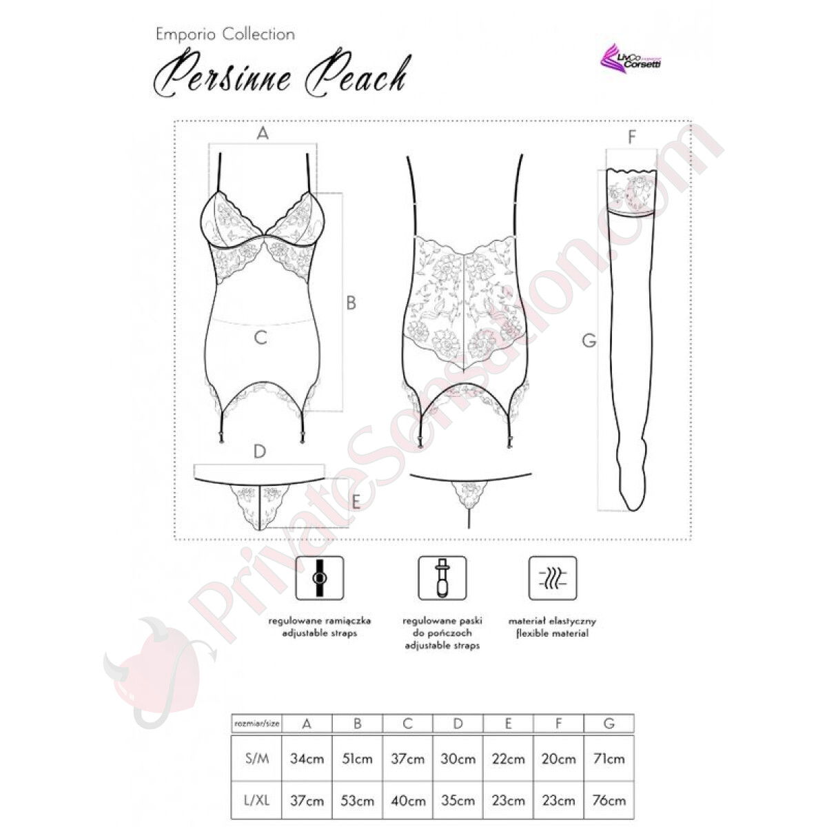 Il set Persinne Peach è incredibilmente versatile. Puoi indossare il corsetto come top elegante sotto una giacca o un abito, oppure creare un look completo con tutti e tre i pezzi per un effetto davvero speciale. I colori delicati del pesca si abbinano perfettamente a ogni tonalità di pelle.