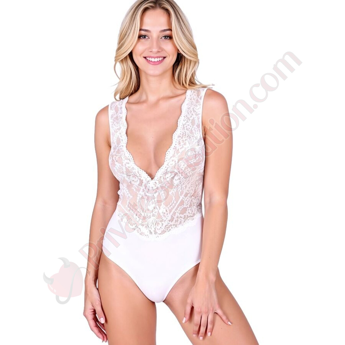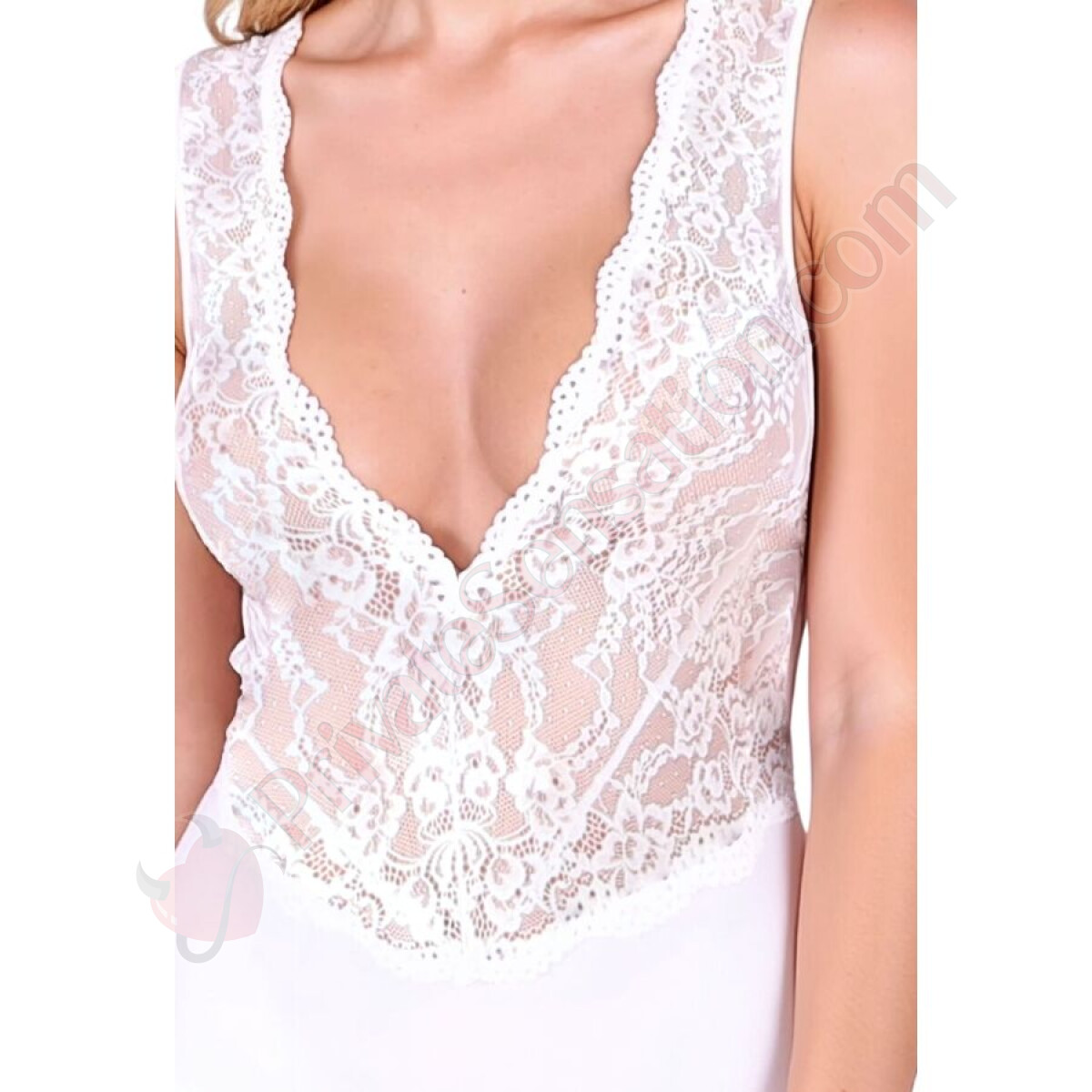 Lo scollo a V profondo, abilmente adornato con pizzo intricato, valorizza il décolleté con grazia e leggerezza, mentre le trasparenze sul davanti aggiungono un tocco audace senza mai risultare eccessivo. La parte inferiore, morbidamente elasticizzata, garantisce un adattamento perfetto al corpo e una vestibilità impeccabile per tutto il giorno.