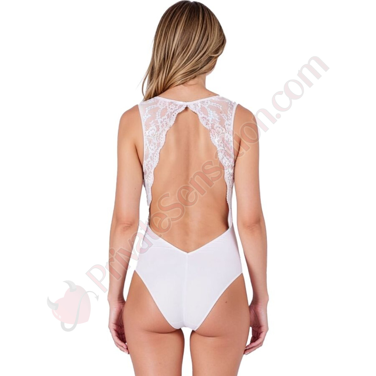 La vera firma del design EVALIE è la schiena, sensualmente scoperta e incorniciata da un pizzo pregiato che fluisce fino a un taglio elegante. Questo elemento architettonico sottolinea con delicatezza le spalle e la linea dorsale, trasformando il body in un capo di impatto visivo straordinario.