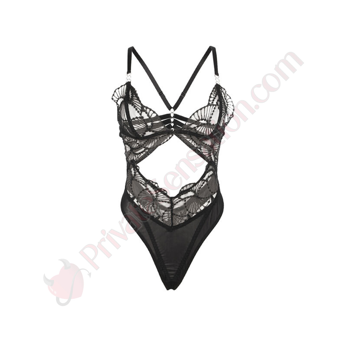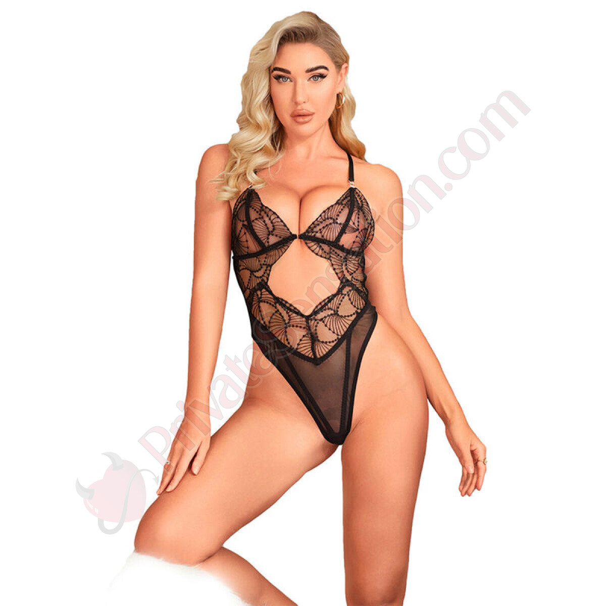 Il design incorpora dettagli in pizzo trasparente che aggiungono un tocco di delicatezza e raffinatezza, mentre i tagli strategici hollow cut esaltano la silhouette, lasciando intravedere la pelle in modo sottile e seducente. L'abbinamento del pizzo con il colore nero, classico e senza tempo, dona un'aria di mistero e sofisticazione che non passerà inosservata.