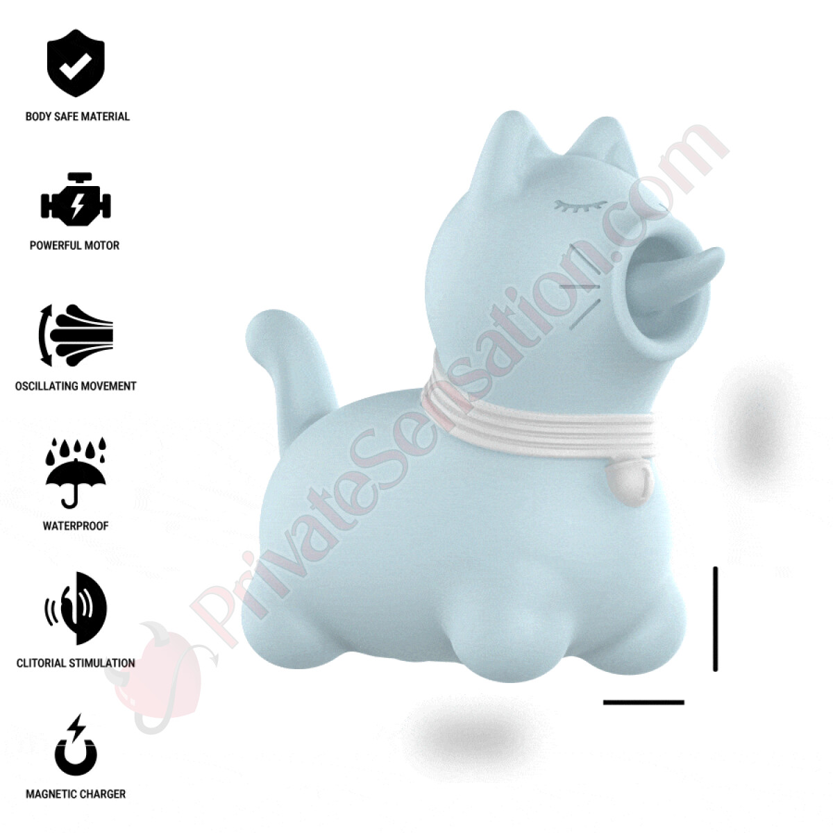 Puppy Licking non è solo potente, ma anche esteticamente piacevole. Il suo design esterno è dolce, moderno e funzionale, con un'estetica ispirata alla tenerezza e al gioco. Il colore blu tenue (simile al Pantone 292U) aggiunge un tocco di freschezza e tranquillità, senza perdere il fascino di un giocattolo sofisticato e pieno di intenzionalità.