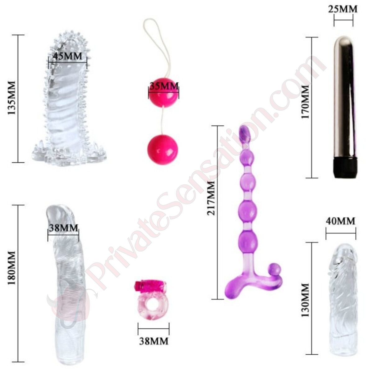 Questo set della Lovers Secret Collection include sette accessori per l'esplorazione del piacere. La confezione contiene diversi articoli per un'esperienza di coppia o individuale.