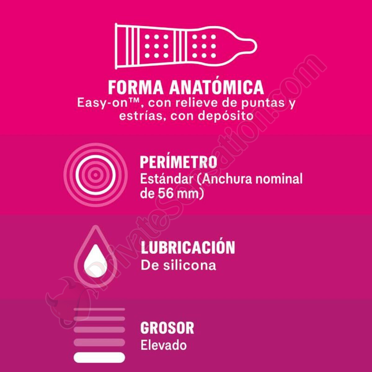 Non si tratta solo di protezione: è un investimento nella qualità della tua vita sessuale. La texture unica di punti e striature non è solo un dettaglio estetico; è un ingegnoso sistema di stimolazione che lavora per aumentare il piacere di entrambi i partner. Ogni movimento diventa più sensuale, ogni contatto più coinvolgente.