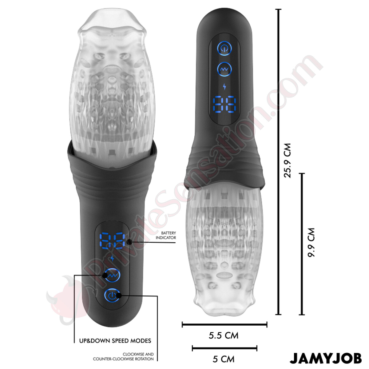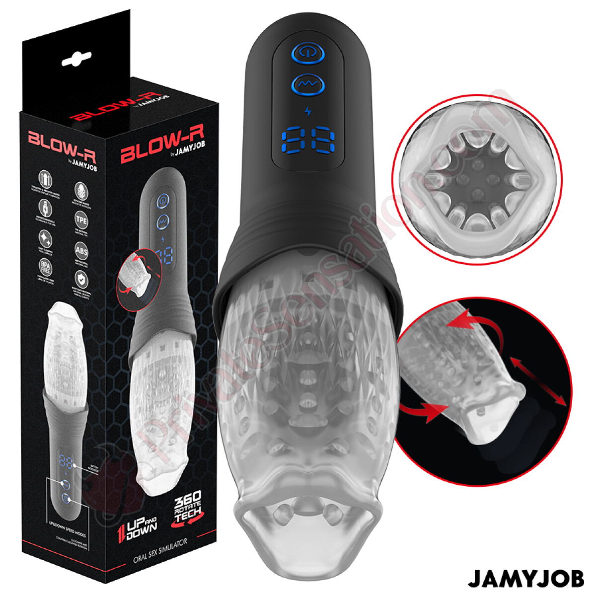 BLOW-R DE JAMYJOB non sacrifica la praticità all'efficacia. Il dispositivo include un manico allungato e resistente che garantisce una presa comoda e sicura durante l'uso, permettendoti di concentrarti completamente sul piacere senza distrazioni. La schermata LED con interfaccia intuitiva rende semplice il controllo di tutte le funzioni, mentre la ricarica USB e la resistenza agli schizzi ti offrono libertà e tranquillità d'uso.