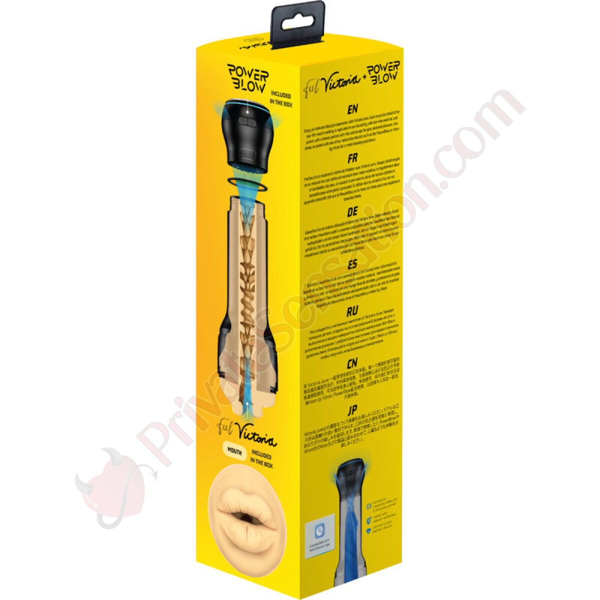 Il FeelVictoria Mouth Stroker è stato specificamente progettato per essere utilizzato con PowerBlow, il dispositivo di suzione interattivo di Kiiroo. Insieme, creano un'esperienza che va oltre l'immaginazione:
