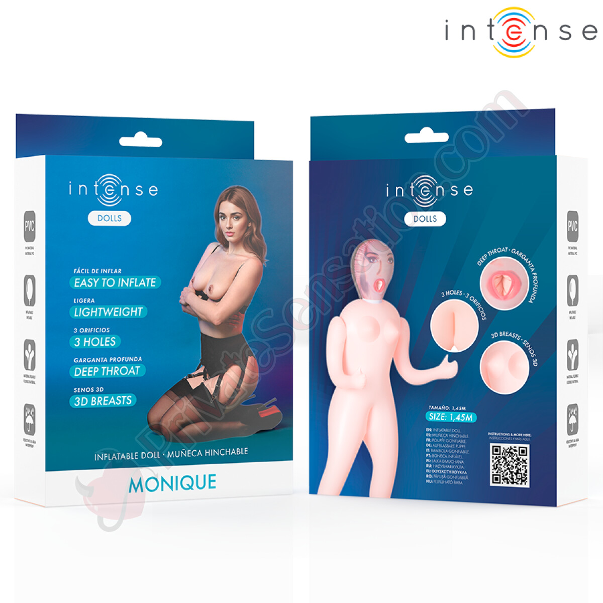 Monique è una bambola gonfiabile progettata per offrire un'esperienza completa grazie ai suoi tre orifizi funzionali e ai dettagli realistici. Con un'altezza di 1,45 m, presenta una struttura leggera e facile da utilizzare, realizzata in PVC flessibile e resistente.