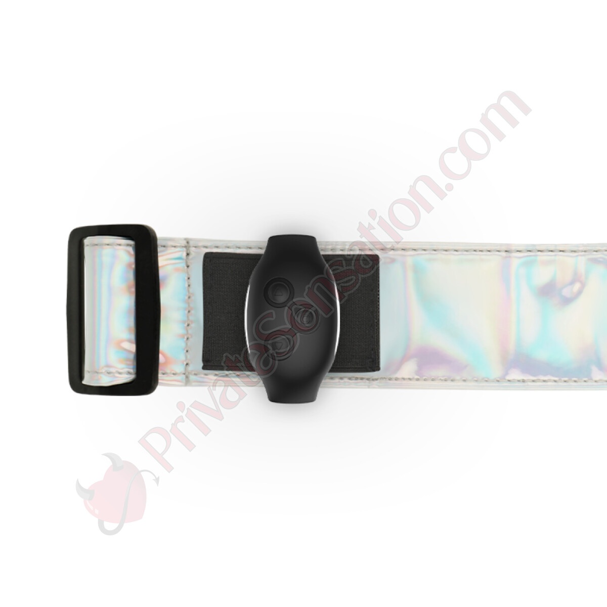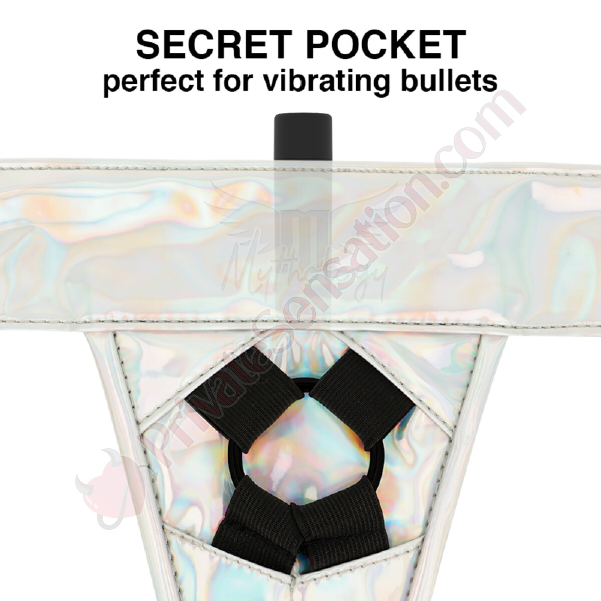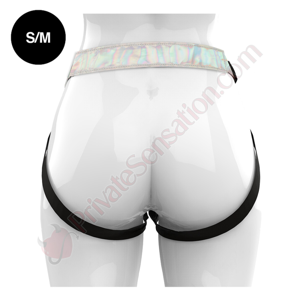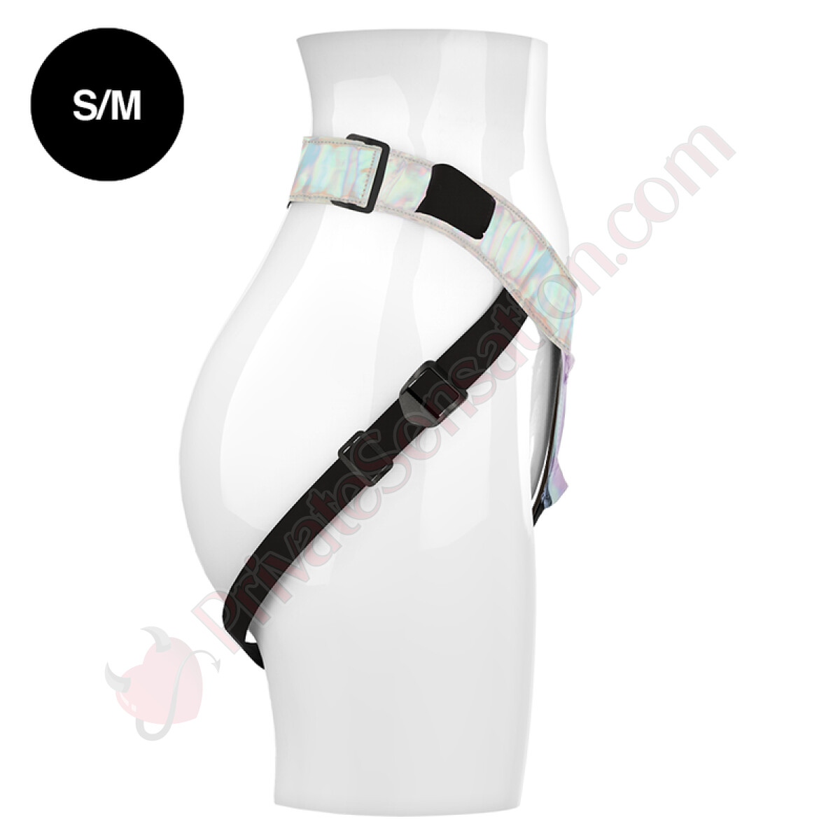 Questa imbracatura per dildo è progettata per offrire comfort e stabilità. Realizzata a mano in Europa, presenta un'originale finitura iridescente che cambia colore a seconda della luce e dell'angolazione. La struttura è composta da una cintura in vita e due cinghie per le gambe, completamente regolabili per adattarsi a diverse corporature.
