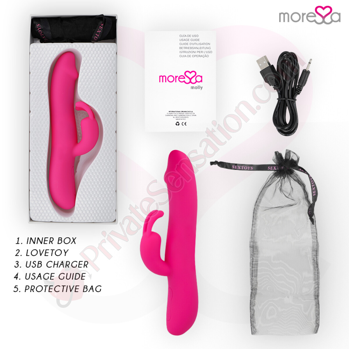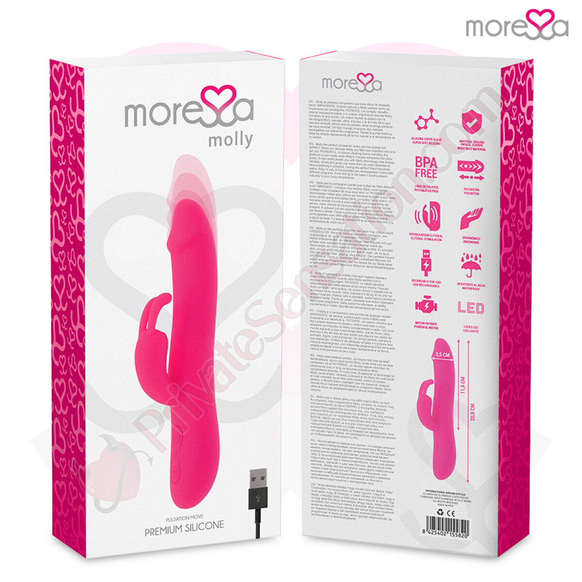 Moressa è il marchio di riferimento per design, qualità e tecnologia nel mondo dell'intrattenimento per adulti. Ogni prodotto, come Molly, è il risultato di un processo di fabbricazione meticoloso e innovativo. Scegliere Moressa significa scegliere energia, forza e garanzia. Significa riflettersi nella modernità e lasciarsi trasportare verso sensazioni uniche, grazie alla silicona premium confortevole e ai design ergonomici che fanno la differenza. Con Molly, il compagno perfetto non è più un sogno: è realtà.