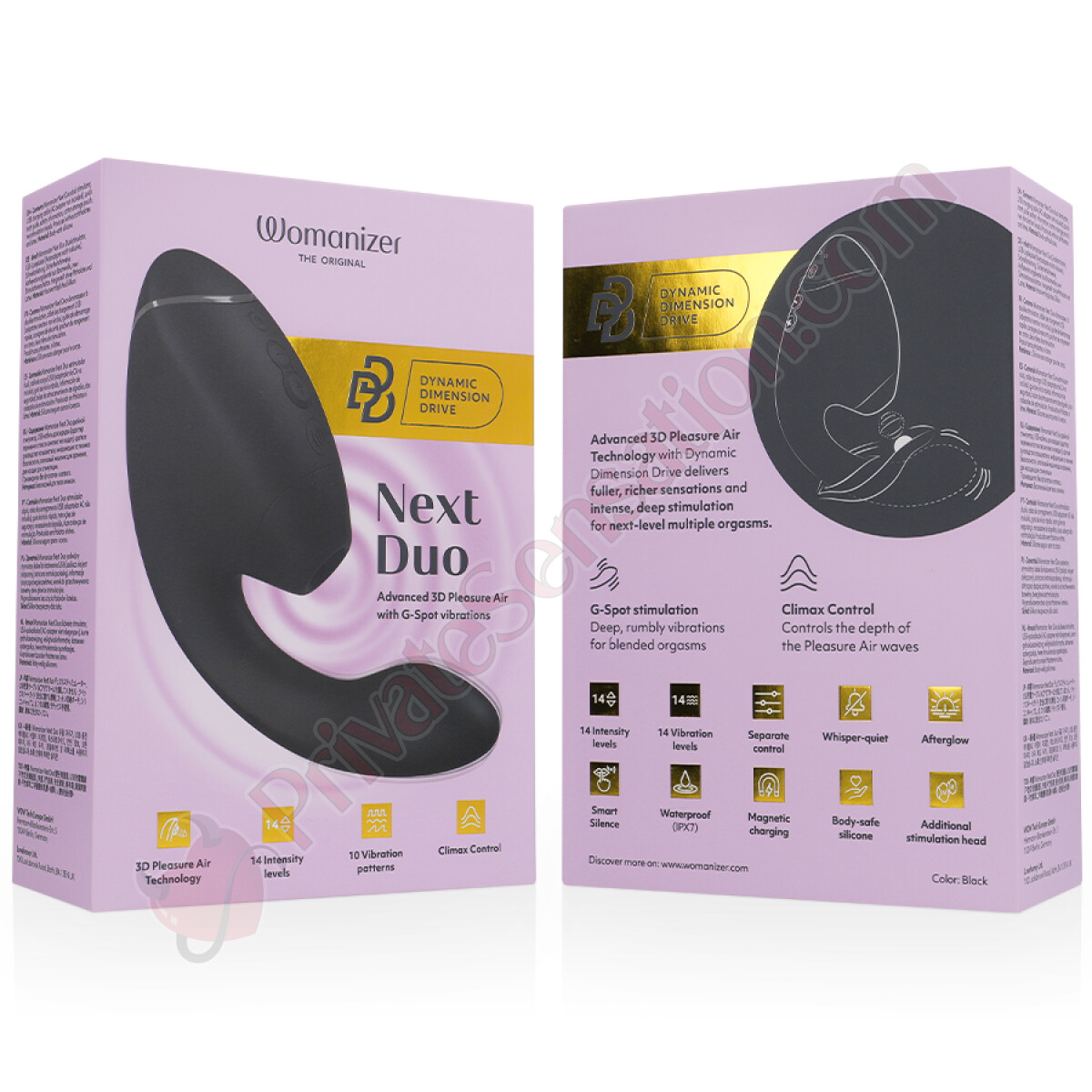 Pronto a sperimentare una nuova dimensione di piacere? Il Next Duo è lo stimolatore duale più avanzato sul mercato, che unisce la rivoluzionaria tecnologia 3D Pleasure Air di Womanizer con le potenti vibrazioni profonde di We-Vibe per il punto G. Questa combinazione innovativa è progettata per creare orgasmi combinati di livello superiore: più naturali, intensi e personalizzati che mai.